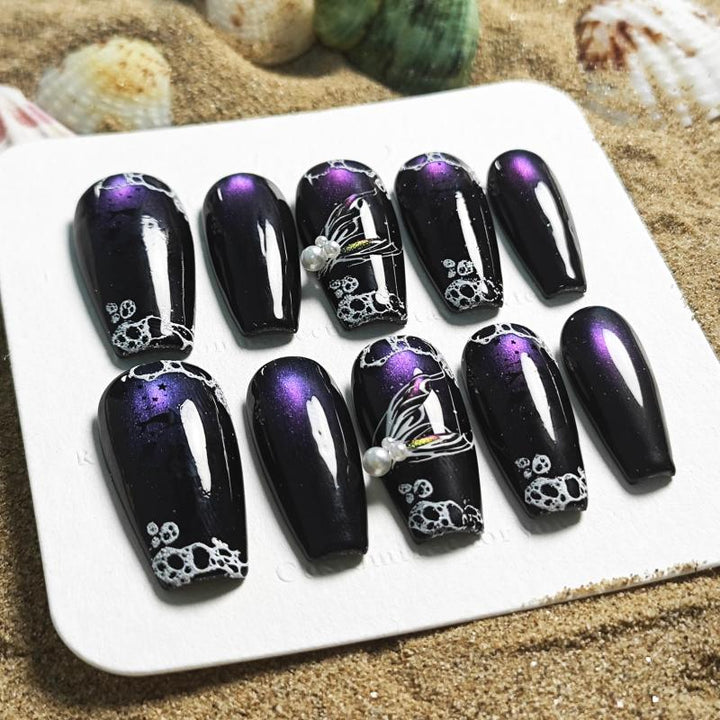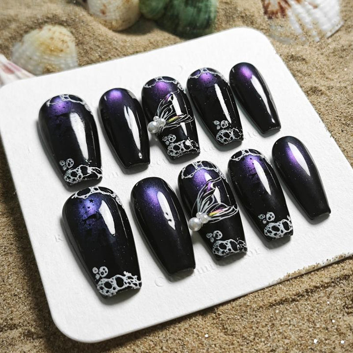 Featuring a mesmerizing deep blue-black base with shimmering cat-eye effects, intricate mermaid tail detailing, delicate bubble patterns, and pearl accents, these nails capture the enchanting allure of the ocean’s depths. Perfect...