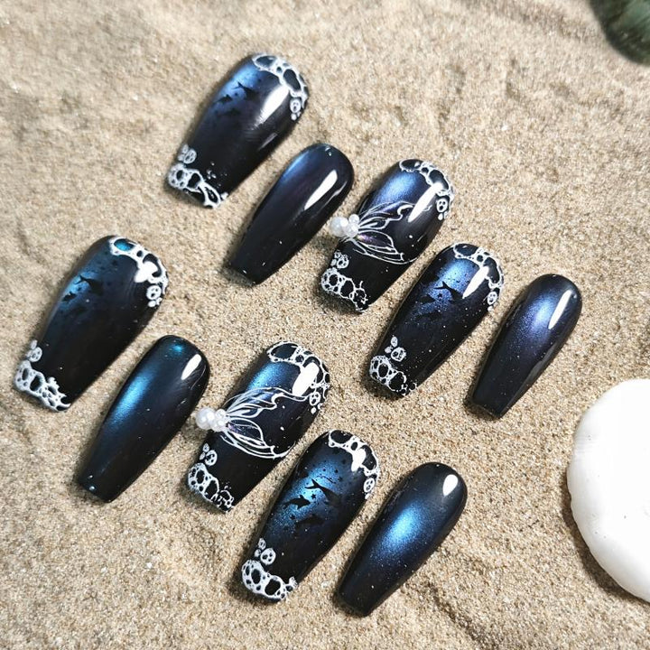 Featuring a mesmerizing deep blue-black base with shimmering cat-eye effects, intricate mermaid tail detailing, delicate bubble patterns, and pearl accents, these nails capture the enchanting allure of the ocean’s depths. Perfect for beach getaways, fantasy-themed events, or adding a touch of mystical coastal charm to your everyday style. Easy to apply and reusable, they offer a hassle-free way to achieve salon-worthy, ocean-inspired nail art in minutes.