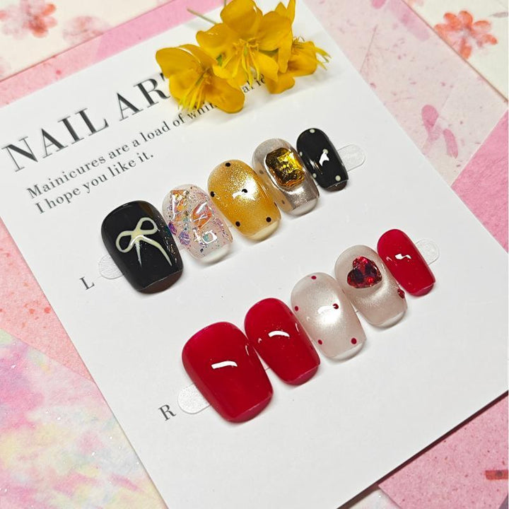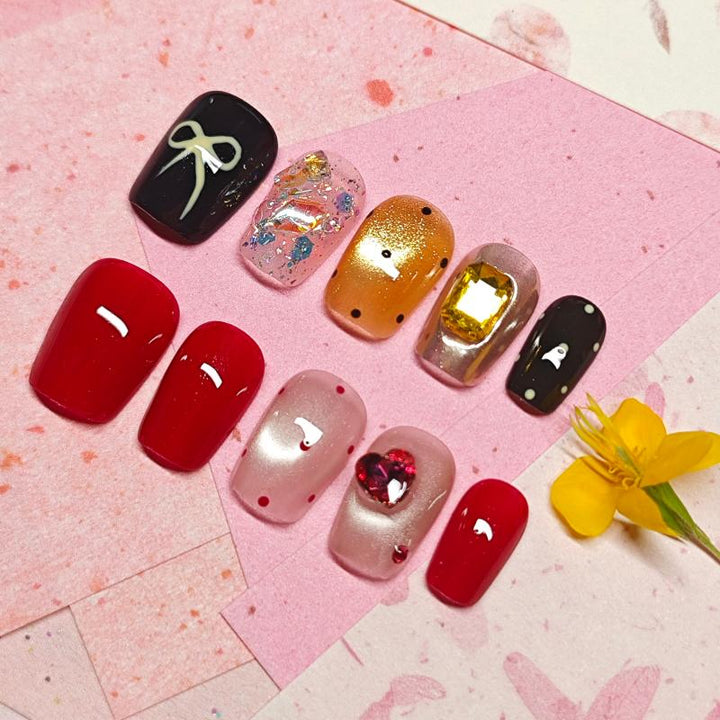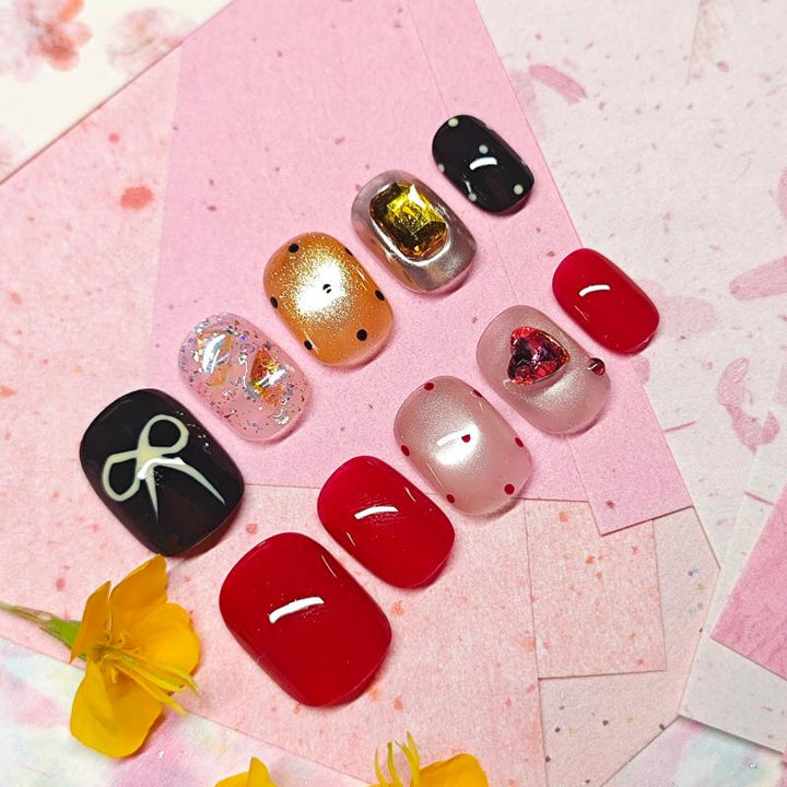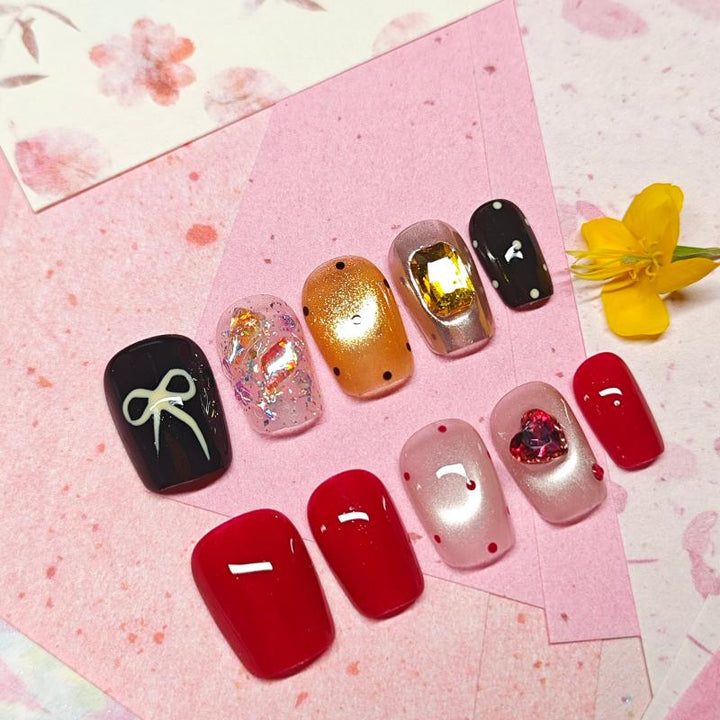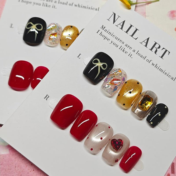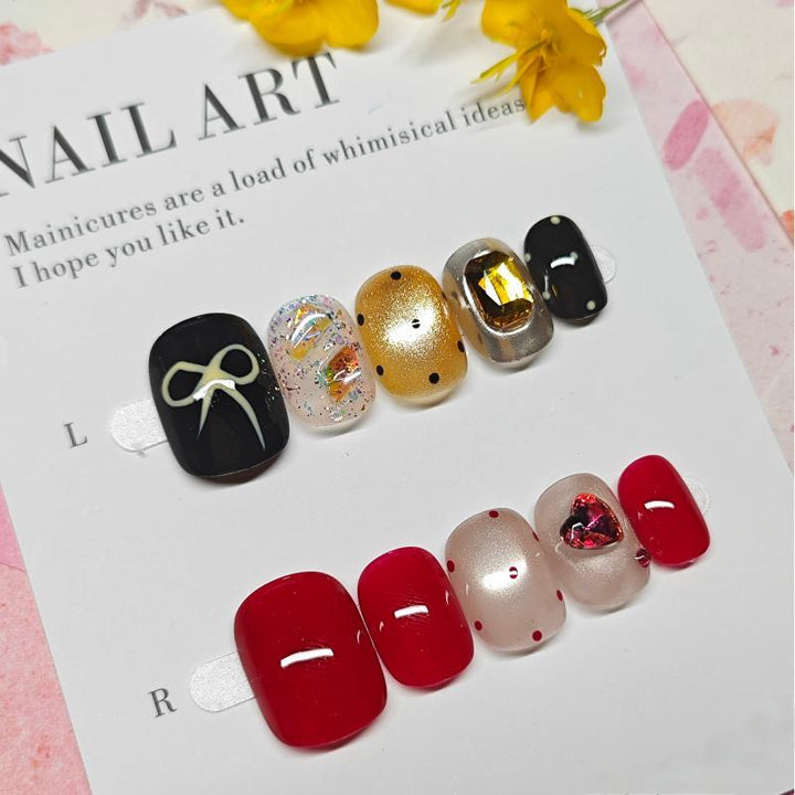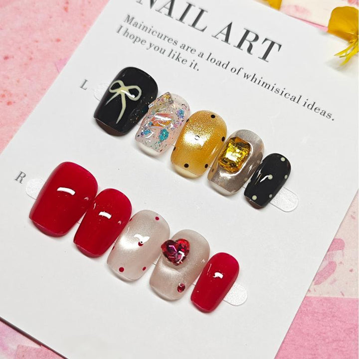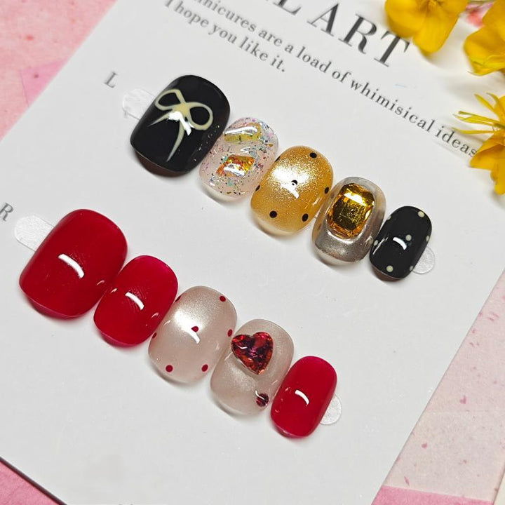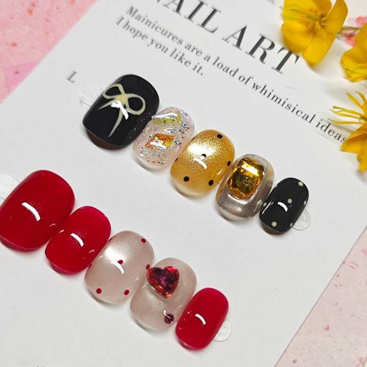 Featuring a playful mix of designs—from a chic black base with a white bow, holographic glitter, gold polka dots, to bold reds with a sparkling heart gem and sheer polka-dot accents—these press-on nails blend whimsy and glamour. Perfect for parties, date nights, or adding a touch of sophistication to your daily look. Easy to apply and reusable, they offer a hassle-free way to achieve salon-worthy, statement-making nails in minutes.