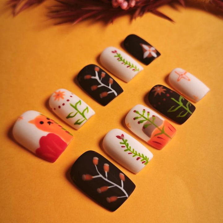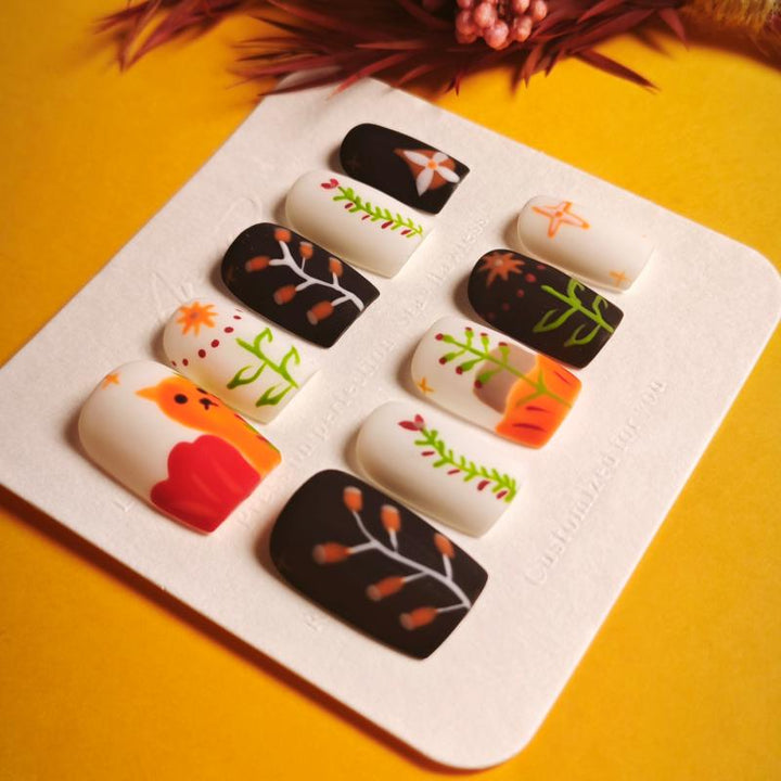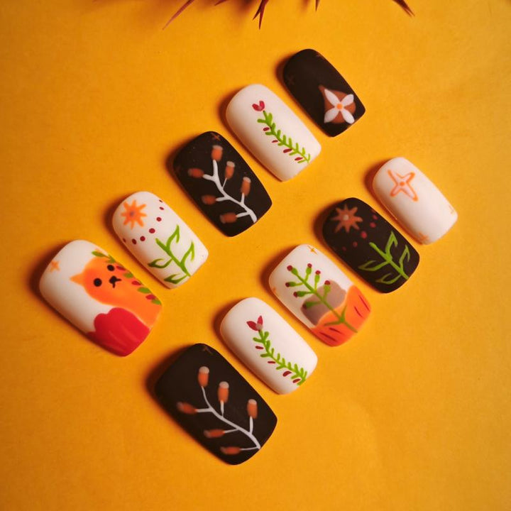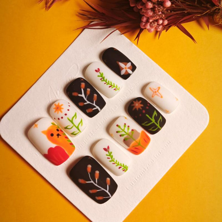 Featuring adorable fox illustrations, delicate floral and branch motifs, and a cozy palette of warm oranges, deep browns, and crisp whites, these press-on nails capture the enchanting charm of autumn. Perfect for embracing the fall season, adding a playful touch to everyday looks, or complementing nature-inspired outfits. Easy to apply and reusable, they offer a hassle-free way to achieve salon-quality, whimsical nail art in minutes.