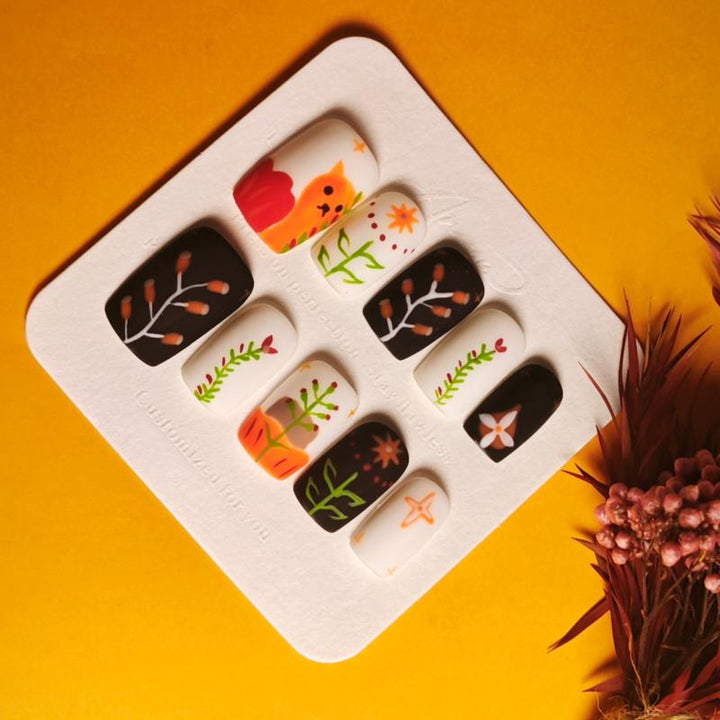 Featuring adorable fox illustrations, delicate floral and branch motifs, and a cozy palette of warm oranges, deep browns, and crisp whites, these press-on nails capture the enchanting charm of autumn. Perfect...