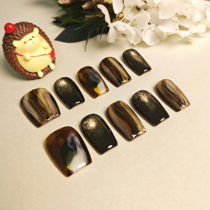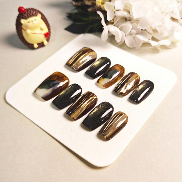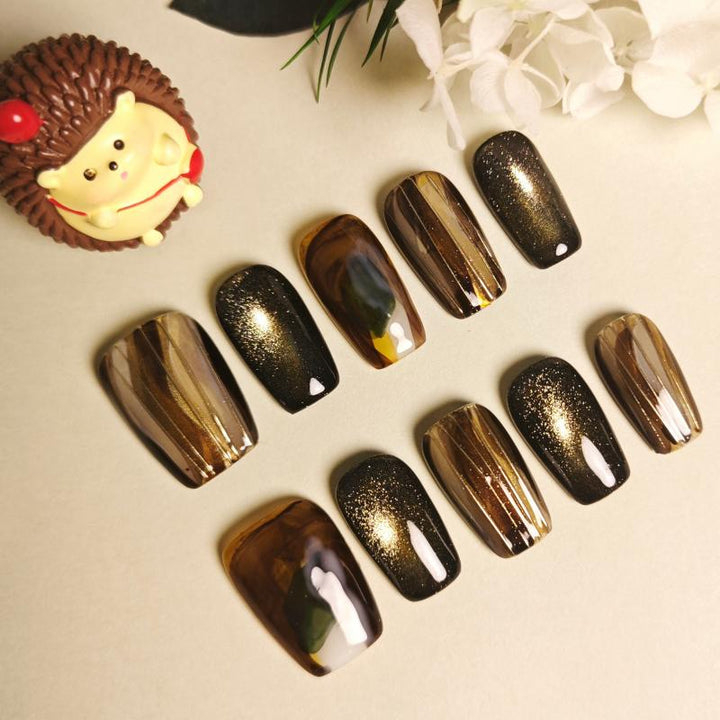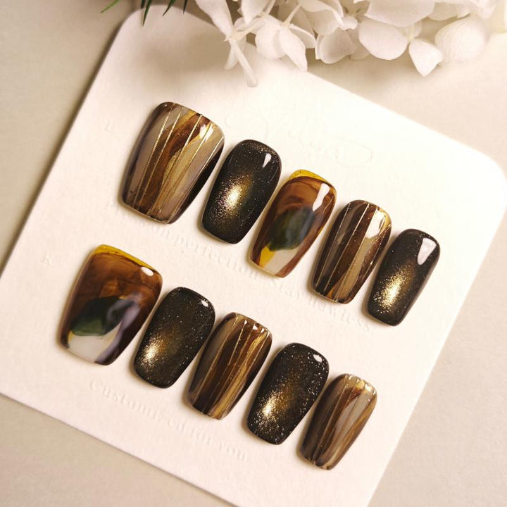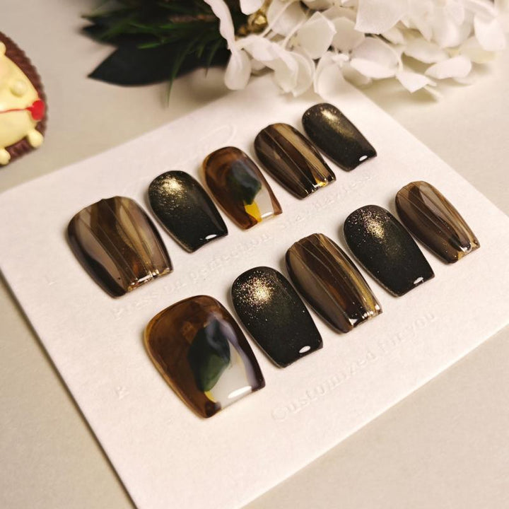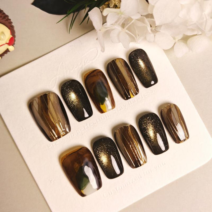 Featuring a sophisticated mix of tortoise shell patterns, deep brown hues, glossy black bases with golden glitter accents, these press-on nails blend vintage charm with modern luxury. Perfect for formal events, evening gatherings, or adding a touch of opulence to your daily look. Easy to apply and reusable, they offer a hassle-free way to achieve salon-quality, glamorous nail art in minutes.
