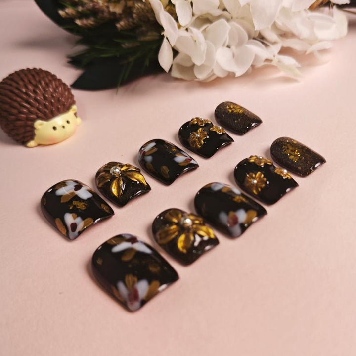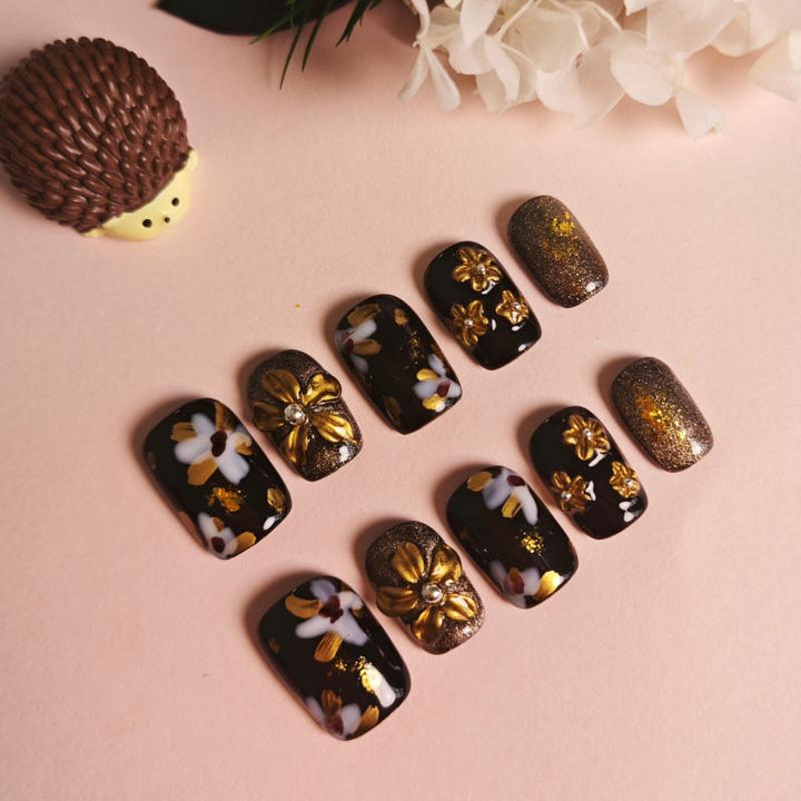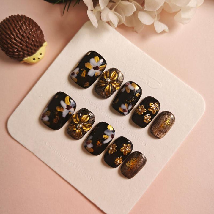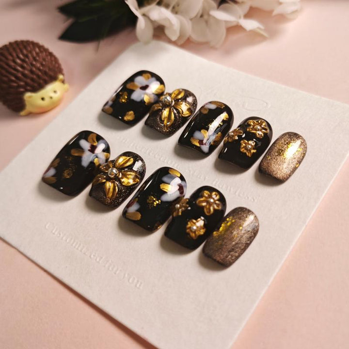 Featuring a sleek black base adorned with intricate gold hand-painted florals, 3D golden flower accents, sparkling rhinestones, and shimmering gold glitter gradients, these press-on nails blend opulent charm with vintage elegance. Perfect for evening galas, special occasions, or adding a touch of luxurious artistry to your daily look. Easy to apply and reusable, they offer a hassle-free way to achieve salon-quality, dazzling nail art in minutes.