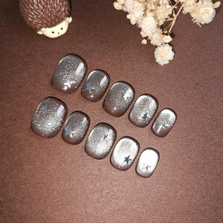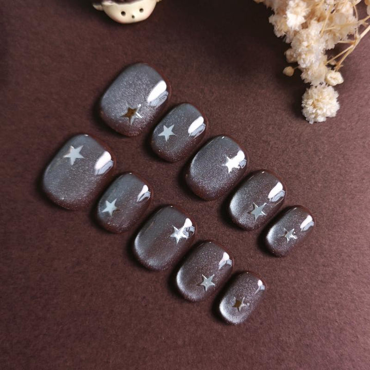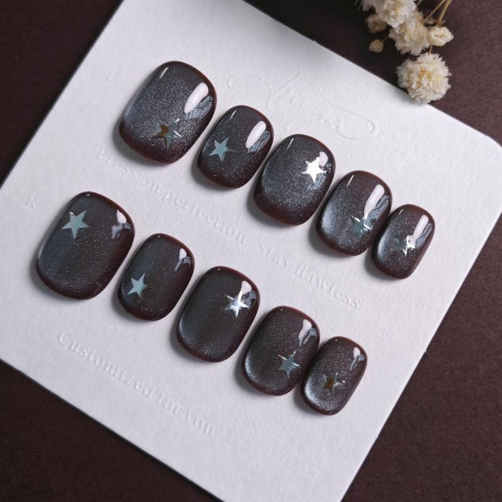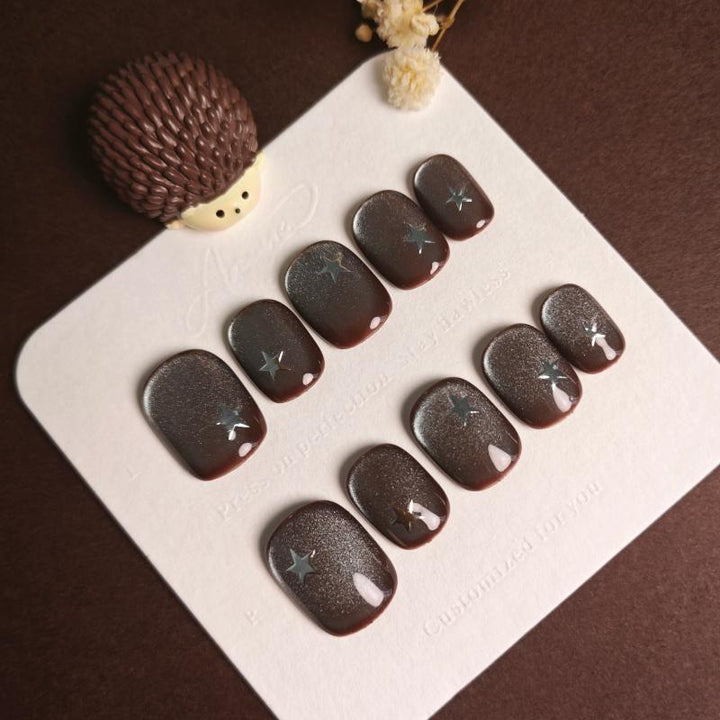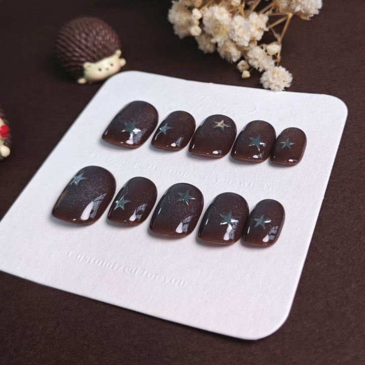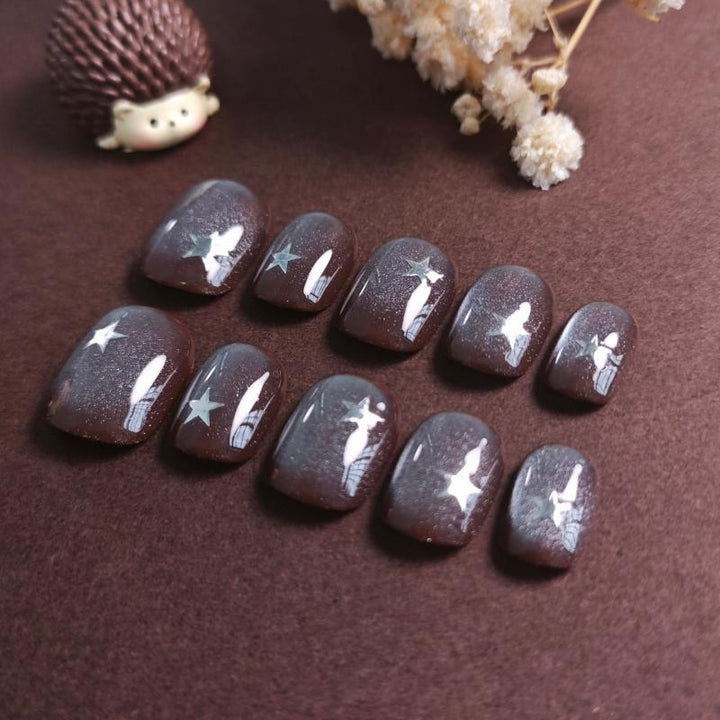 Featuring a rich dark brown base with subtle glitter shimmer and delicate star accents, these press-on nails blend cozy autumnal charm with a touch of celestial whimsy. Perfect for everyday wear, casual outings, or adding a polished, sophisticated glow to your look. Easy to apply and reusable, they offer a hassle-free way to achieve salon-quality nail art in minutes.