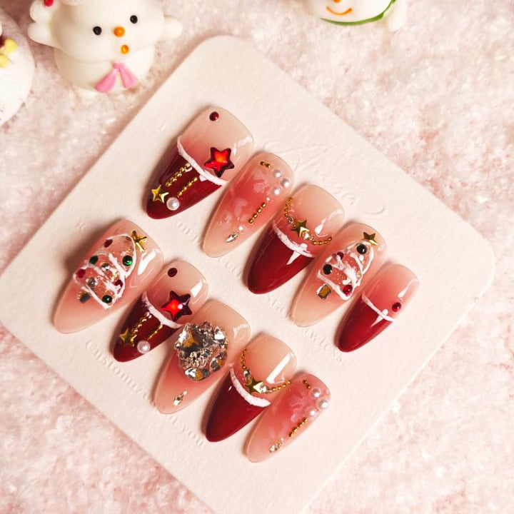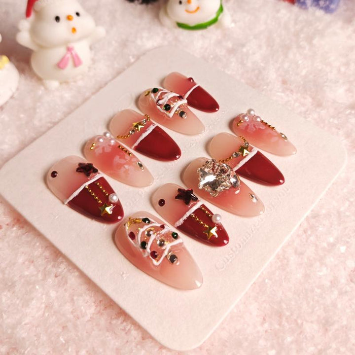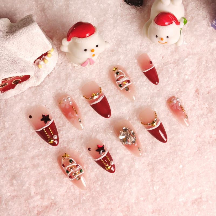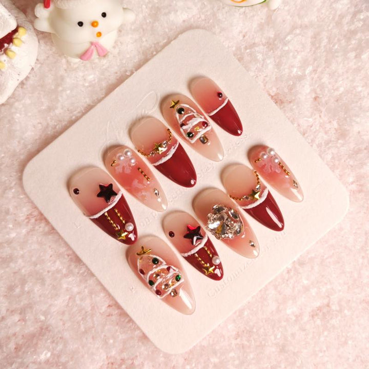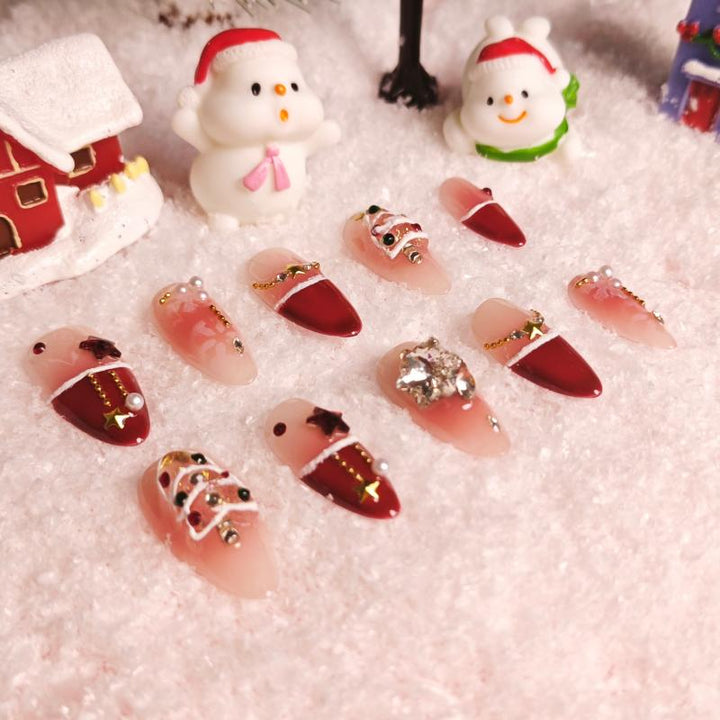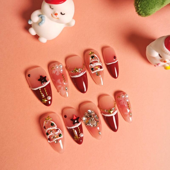 Featuring a dreamy blush-pink to deep red gradient base, adorned with 3D Christmas trees, twinkling stars, pearls, and sparkling rhinestones, these nails are the epitome of sweet yet glamorous Christmas charm.