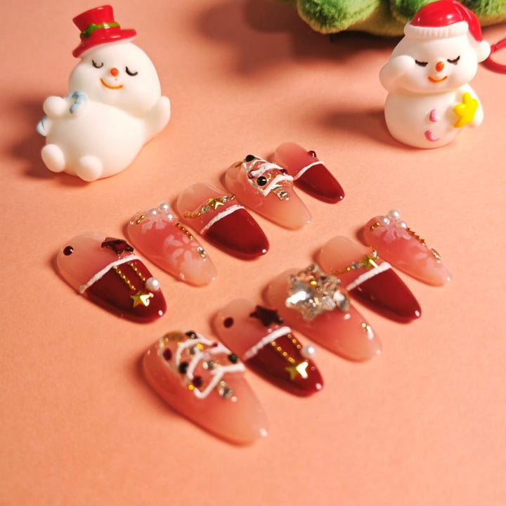 Crafted with high-quality materials, they offer a comfortable fit and long-lasting wear. Whether you’re attending a Christmas party, doing holiday shopping, or simply want to add a touch of festive luxury to your everyday style, these nails are perfect. Each nail has a unique design—think mini Christmas trees with colorful ornaments, star details, and delicate pearl chains—that will make your hands stand out in every holiday moment.