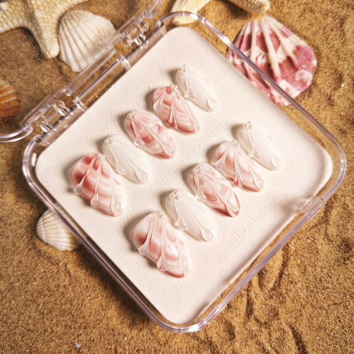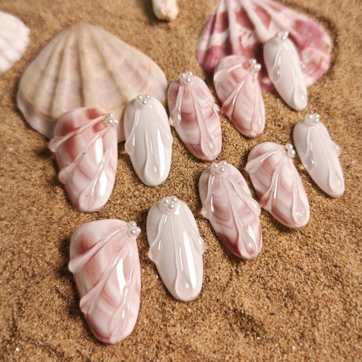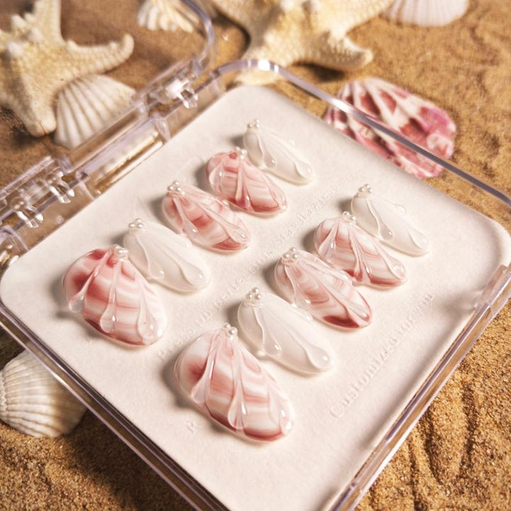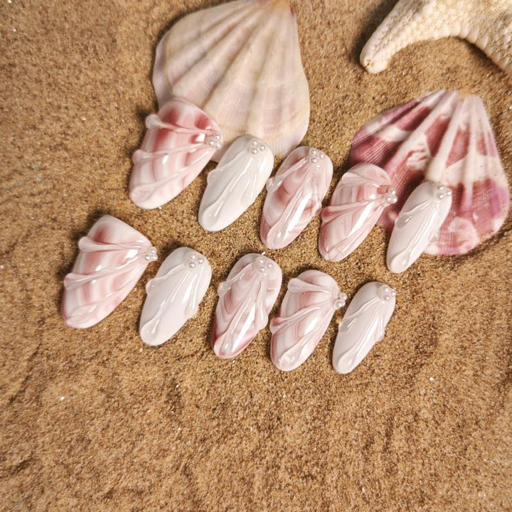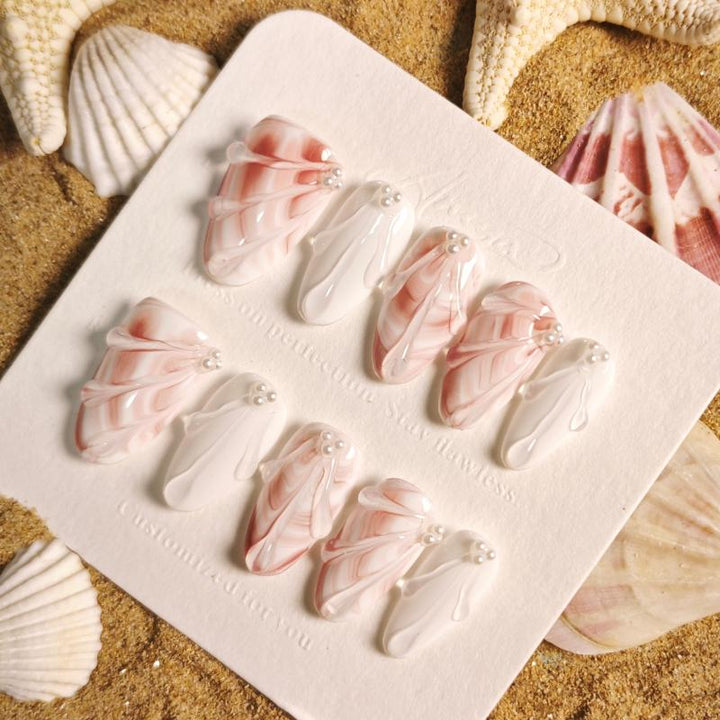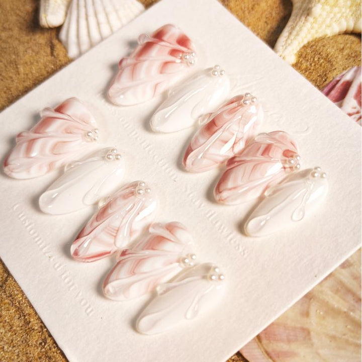 Featuring 3D ribbon-like textures, soft pink & white marble swirls, and delicate tiny pearl accents, these press-on nails blend coastal charm with bridal-worthy sophistication. Perfect for beach weddings, romantic getaways, or adding a refined, whimsical touch to your daily look. Easy to apply and reusable, they offer a hassle-free way to achieve salon-quality, artistic nail art in minutes.