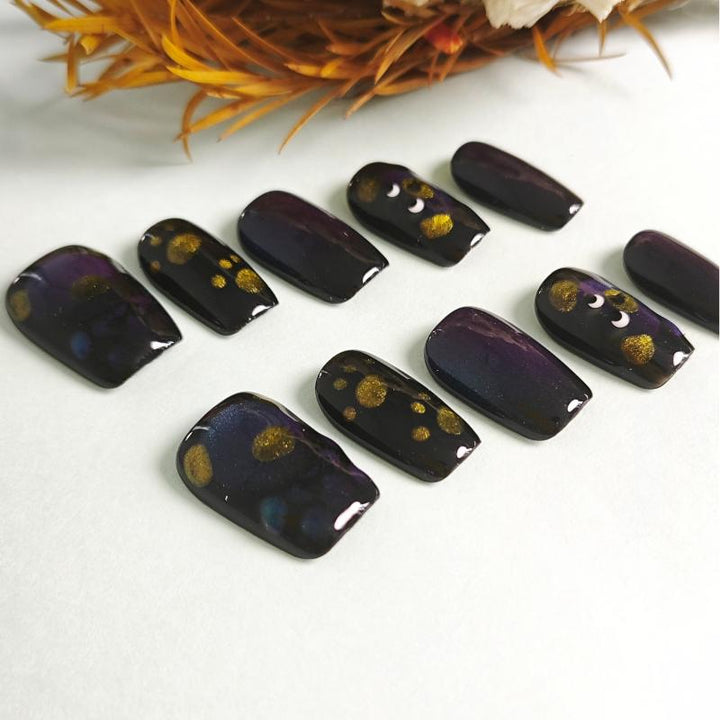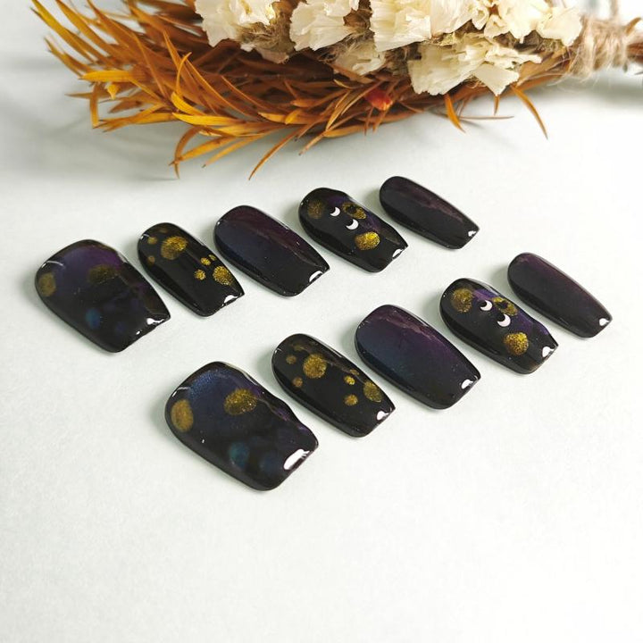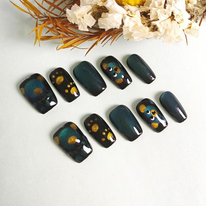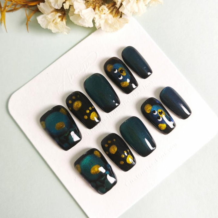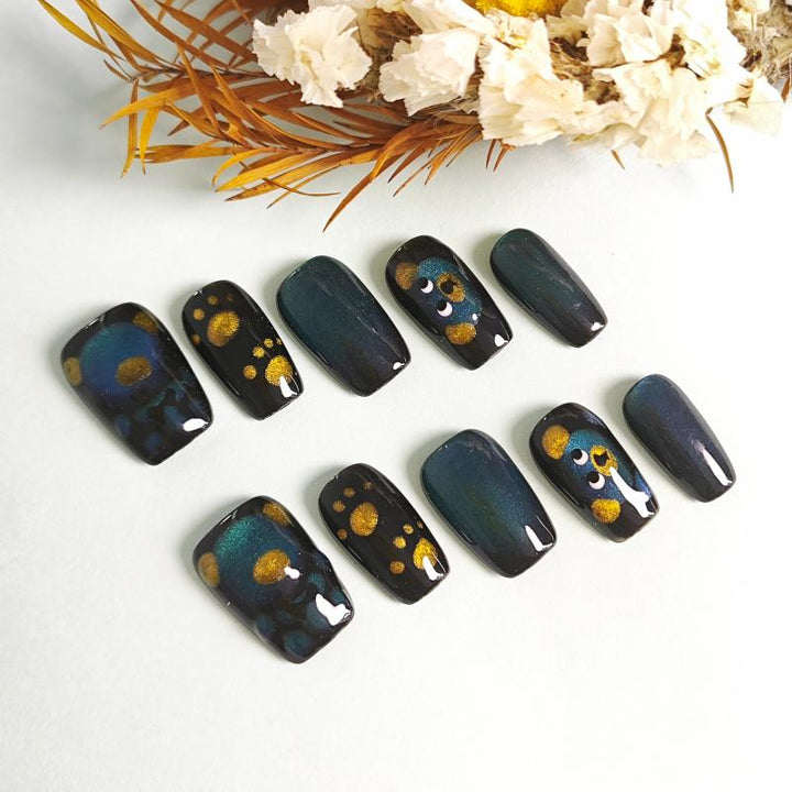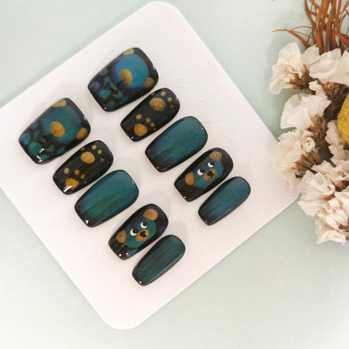 Featuring a rich teal base with artistic golden spot patterns and adorable bear face details, these press-on nails blend whimsical cuteness with artistic flair. Perfect for adding a playful yet sophisticated touch to your daily looks or special occasions. Easy to apply and reusable, they offer a hassle-free way to achieve salon-quality nail art in minutes.