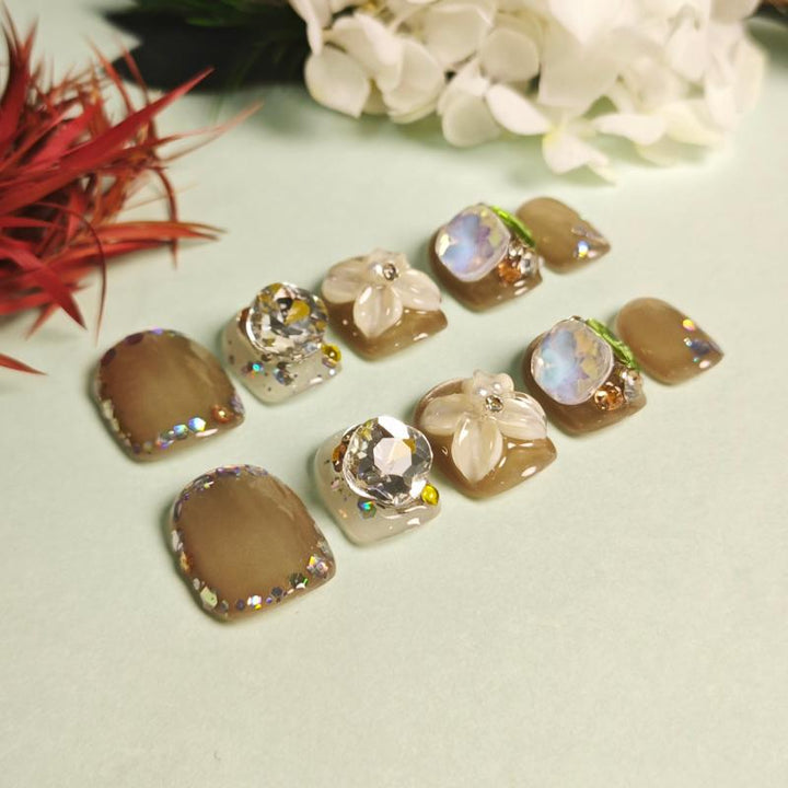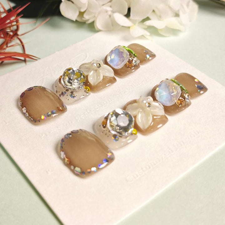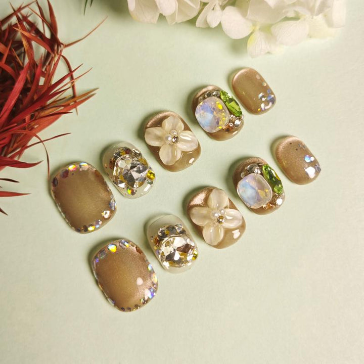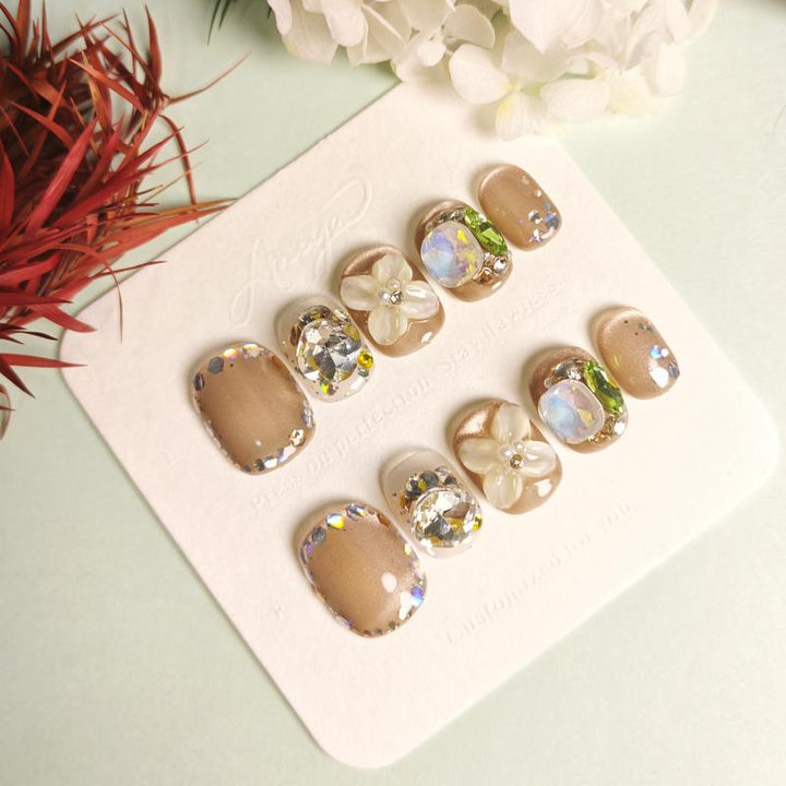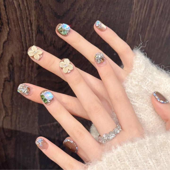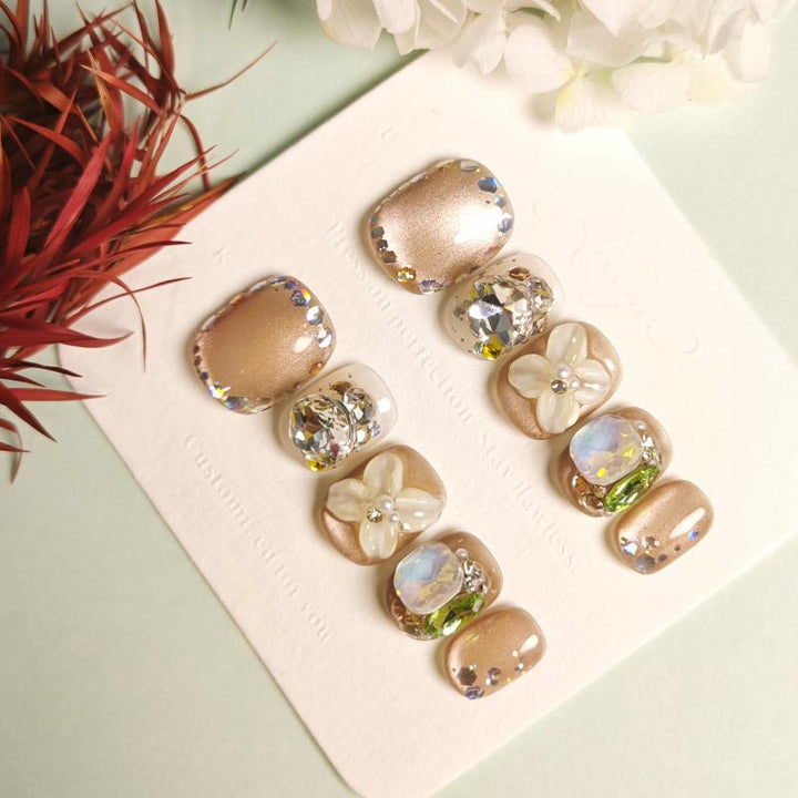 Featuring a soft nude base adorned with large sparkling crystals, 3D floral accents, opal-like gem details, and iridescent glitter specks, these press-on nails blend luxurious charm with delicate femininity. Perfect for special occasions, weddings, or adding a touch of refined glamour to your daily look. Easy to apply and reusable, they offer a hassle-free way to achieve salon-quality, dazzling nail art in minutes.