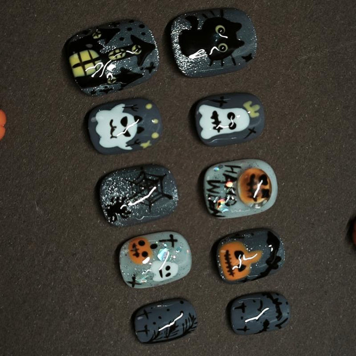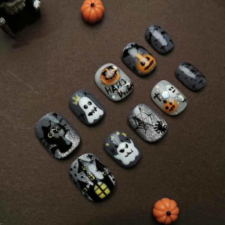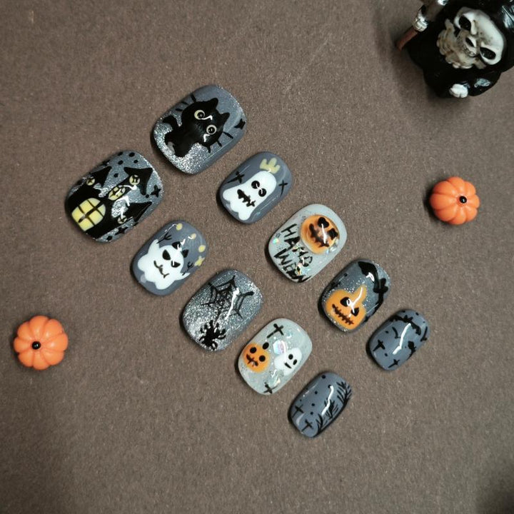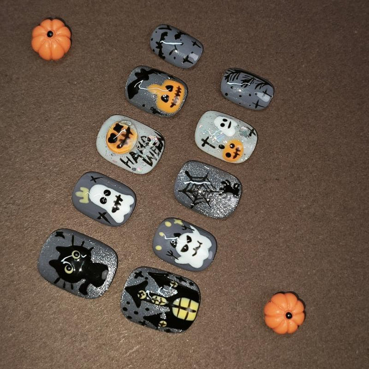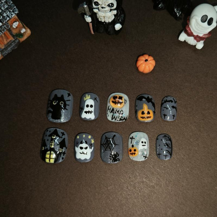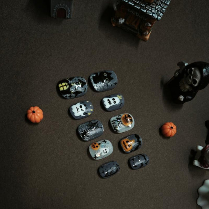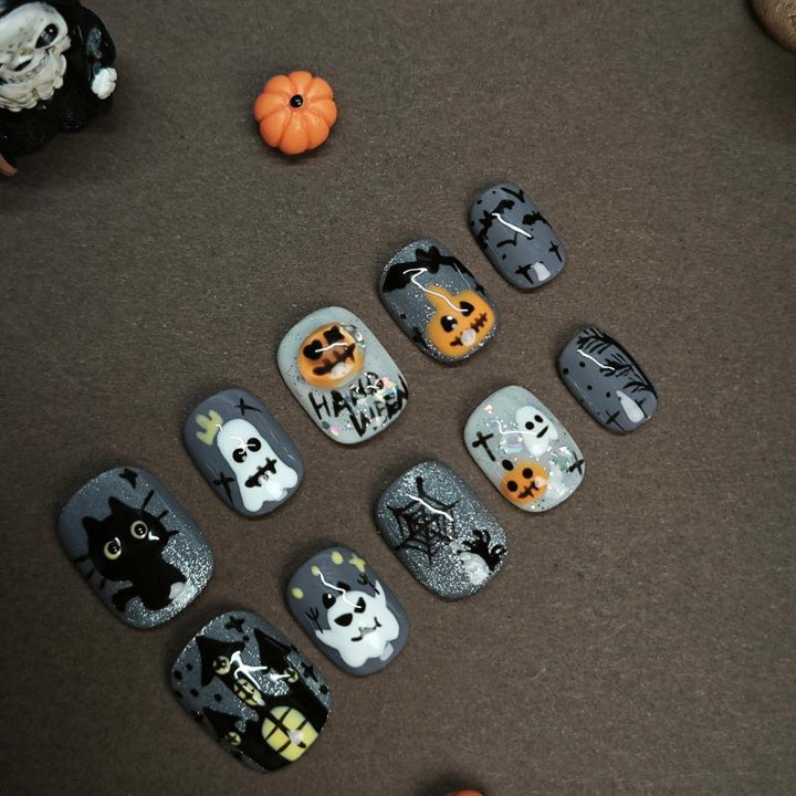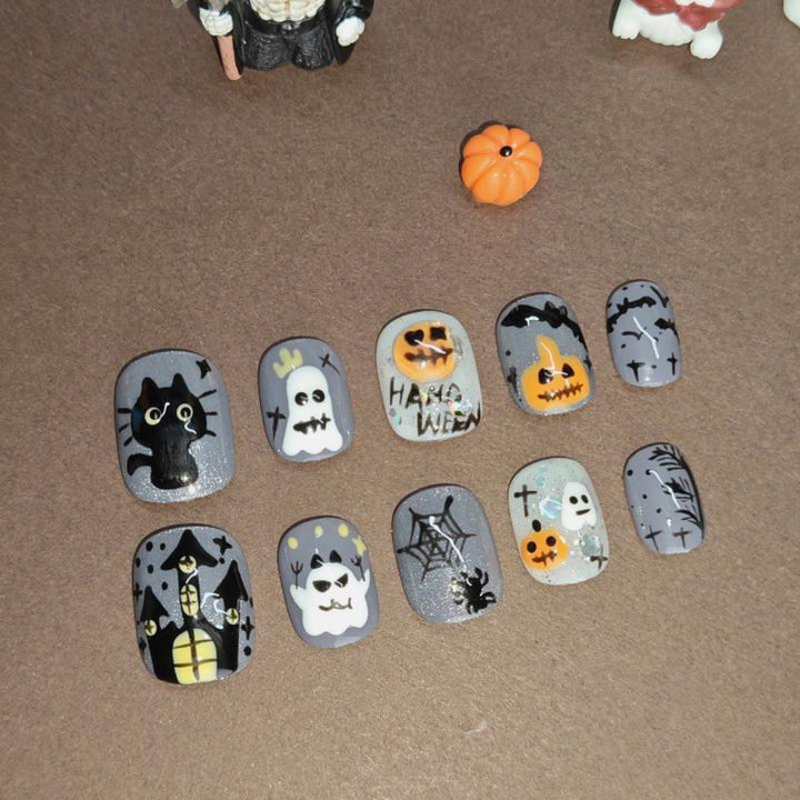 Featuring adorable designs like friendly ghosts, grinning pumpkins, a curious black cat, haunted houses, bats, and spider webs, all set against soft gray bases, these press-on nails bring a playful yet...