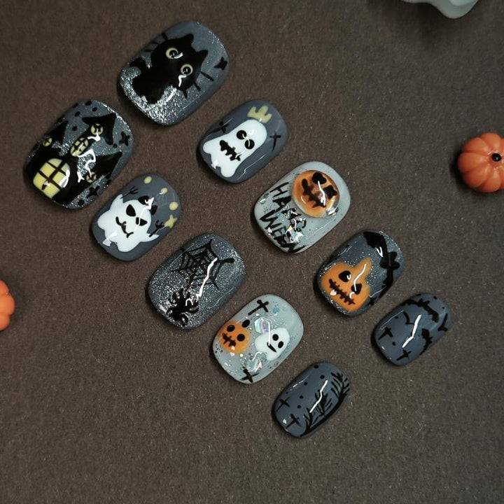 Featuring adorable designs like friendly ghosts, grinning pumpkins, a curious black cat, haunted houses, bats, and spider webs, all set against soft gray bases, these press-on nails bring a playful yet spooky vibe to your manicure. Perfect for Halloween parties, costume events, or adding a whimsical Halloween touch to your fall style. Easy to apply and remove, they’re a hassle-free way to embrace the Halloween spirit with salon-worthy nail art.
