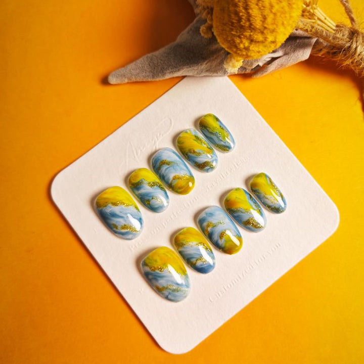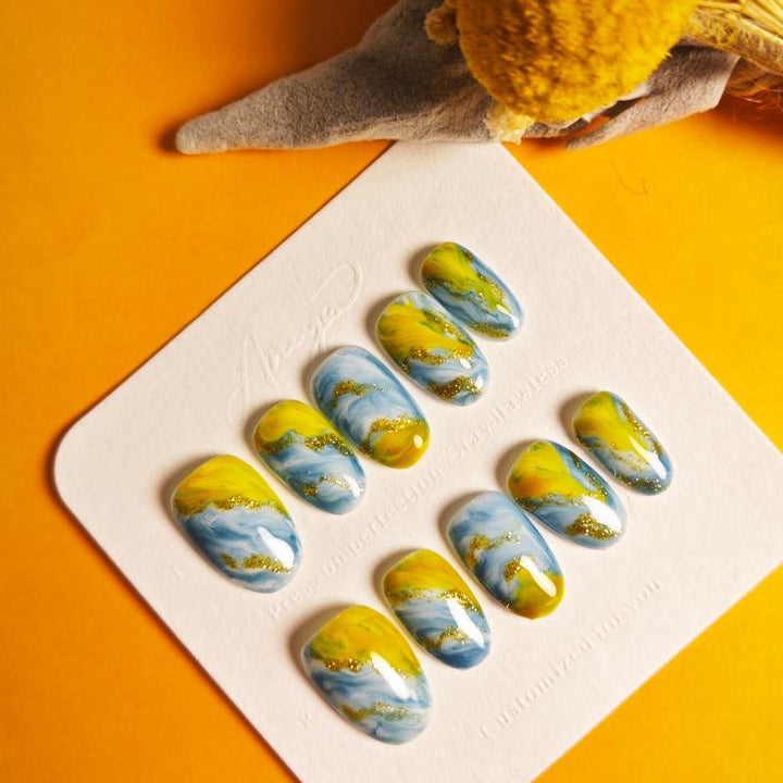 Featuring a dreamy marble blend of sunny yellow, ocean blue, and shimmering gold glitter accents, these press-on nails capture the vibrant energy of sunny days by the sea. Perfect for beach getaways, summer festivals, or adding a playful, luminous touch to your daily style. Easy to apply and reusable, they offer a hassle-free way to achieve salon-quality, vacation-ready nail art in minutes.