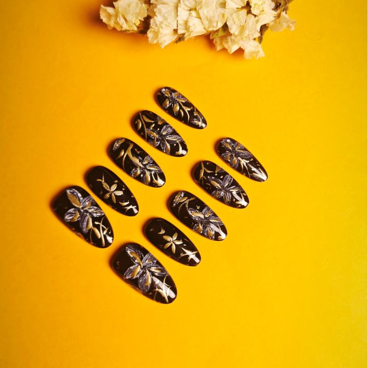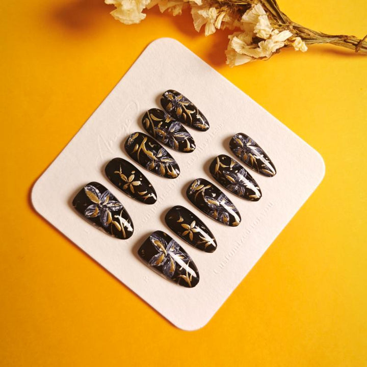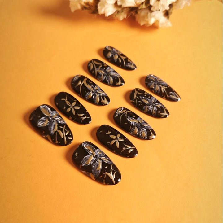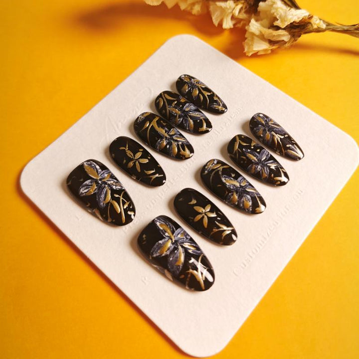 Featuring intricate gold and silver floral patterns on a glossy black base, these press-on nails exude luxury and artistic charm. Perfect for formal events, evening gatherings, or adding a touch of...