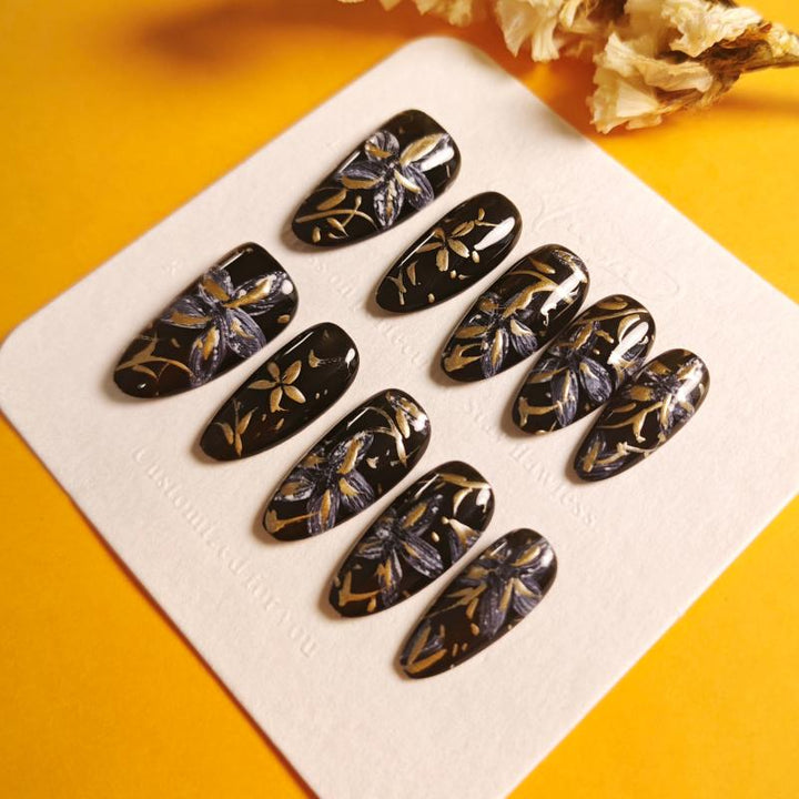 Featuring intricate gold and silver floral patterns on a glossy black base, these press-on nails exude luxury and artistic charm. Perfect for formal events, evening gatherings, or adding a touch of opulence to your daily look. Easy to apply and reusable, they offer a hassle-free way to achieve salon-quality, glamorous nail art in minutes.