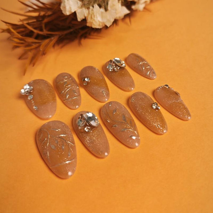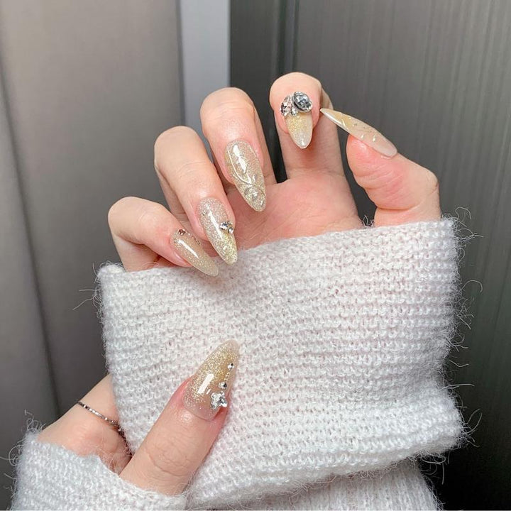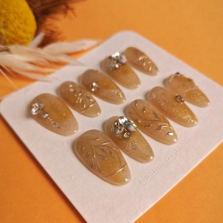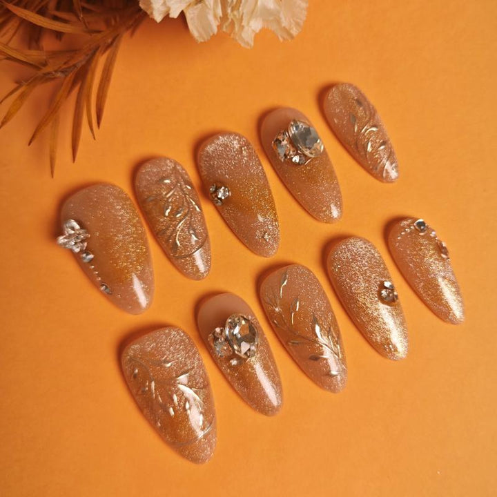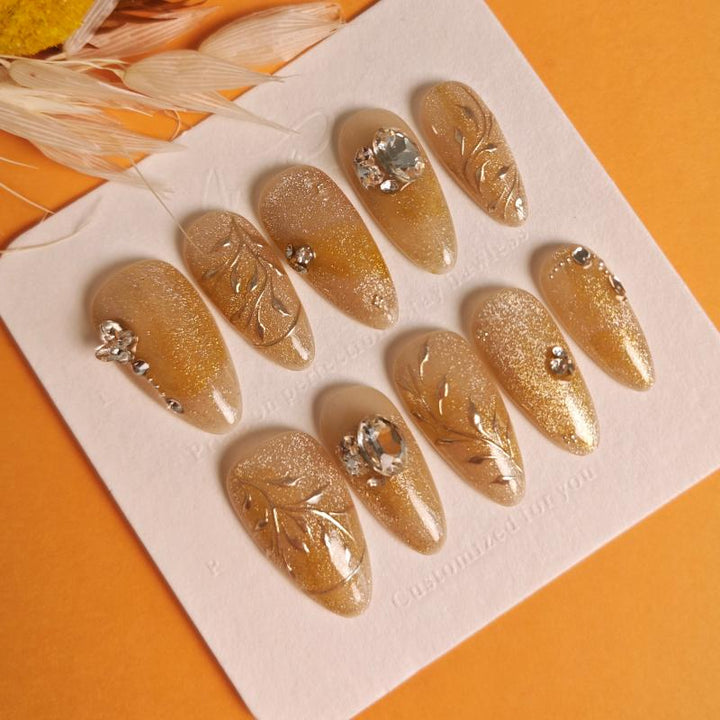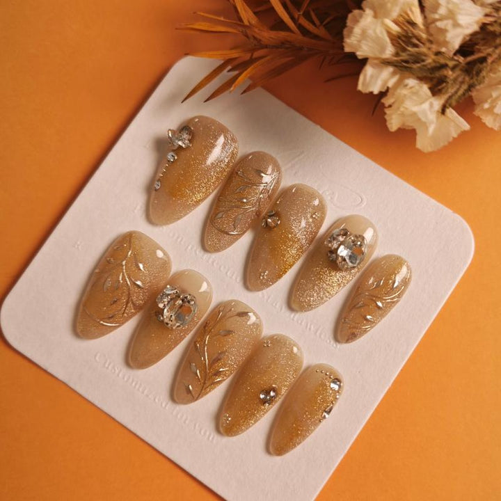 Featuring a warm gold gradient with shimmering glitter, delicate metal leaf filigree details, and sparkling crystal accents (including statement gemstones), these press-on nails blend opulent charm with intricate artistry. Perfect for weddings, evening galas, or adding a touch of royal sophistication to any look. Easy to apply and reusable, they offer a hassle-free way to achieve salon-quality, dazzling nail art in minutes.
