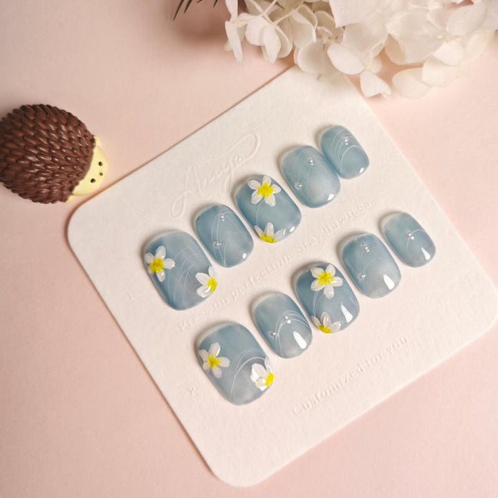 Featuring a soft sheer blue-grey base adorned with hand-painted white flowers (with sunny yellow centers) and delicate curving line details, these press-on nails blend airy charm with whimsical floral artistry. Perfect for spring days, casual outings, or adding a touch of dreamy elegance to your daily look. Easy to apply and reusable, they offer a hassle-free way to achieve salon-quality, eye-catching nail art in minutes.