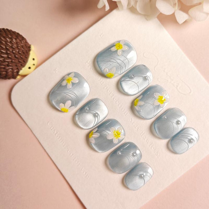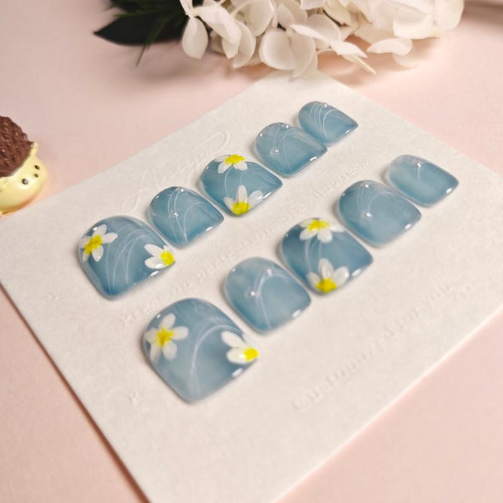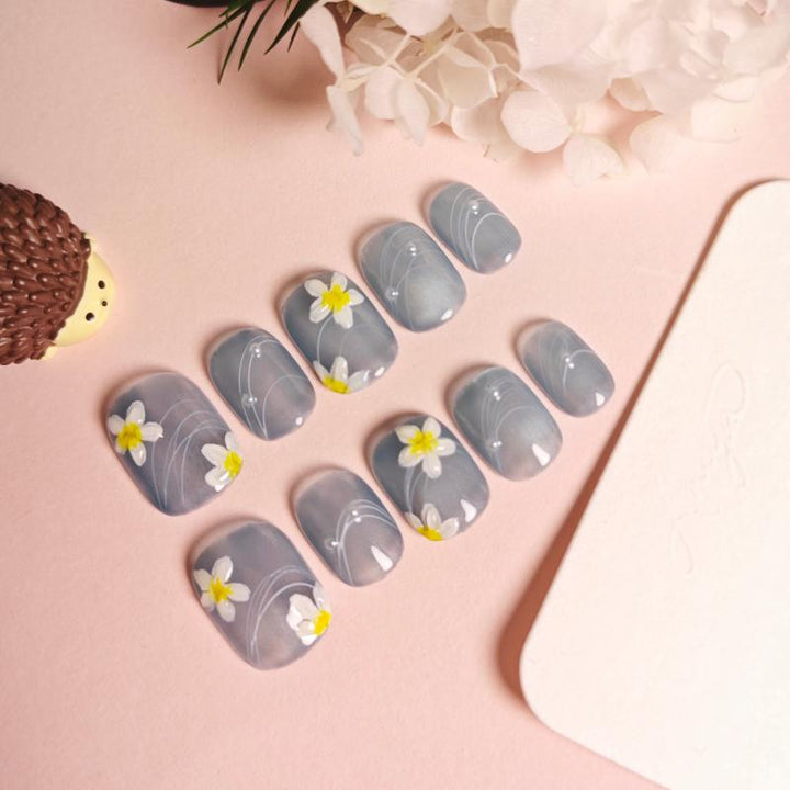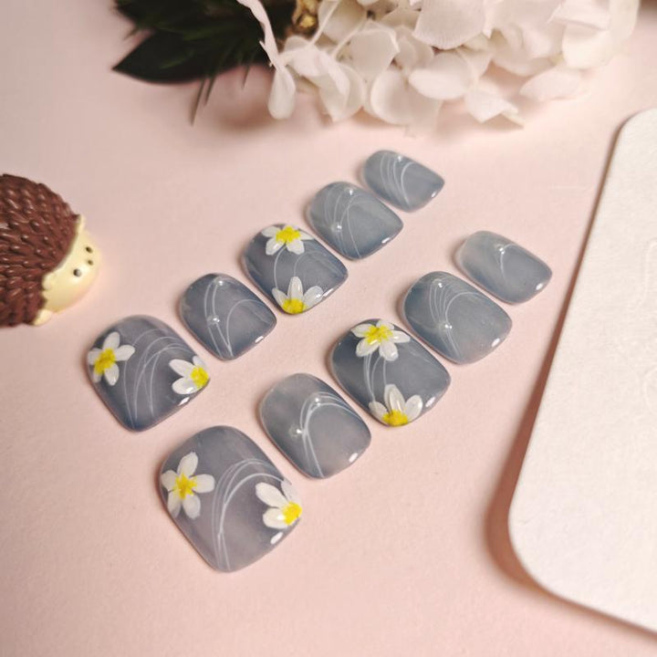 Featuring a soft sheer blue-grey base adorned with hand-painted white flowers (with sunny yellow centers) and delicate curving line details, these press-on nails blend airy charm with whimsical floral artistry. Perfect...