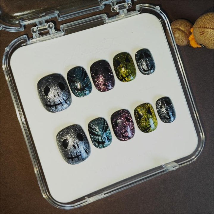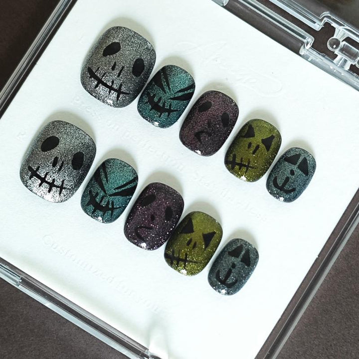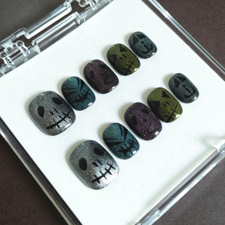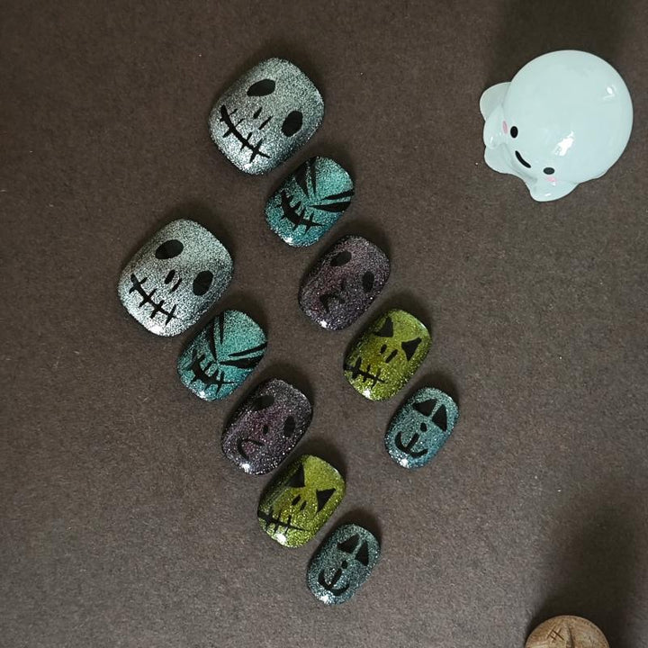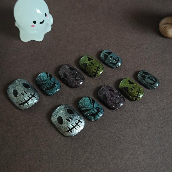 Featuring shimmering glitter gradients in moody hues (silver, teal, purple, olive), paired with spooky skull and pumpkin designs, these press-on nails bring a festive, eerie charm to your manicure. Perfect for Halloween parties, costume events, or adding a whimsical spooky touch to your fall looks. Easy to apply and reusable, they offer a hassle-free way to embrace the Halloween spirit with salon-worthy nail art.