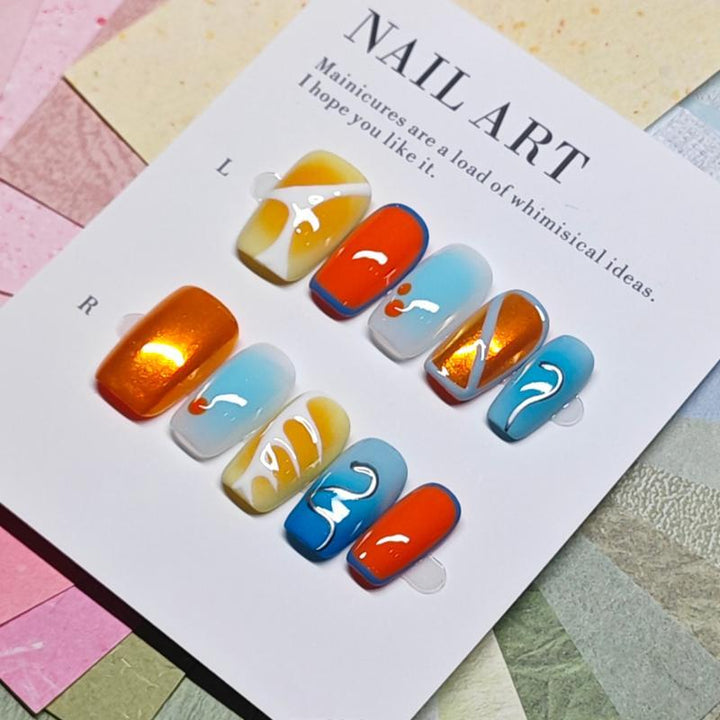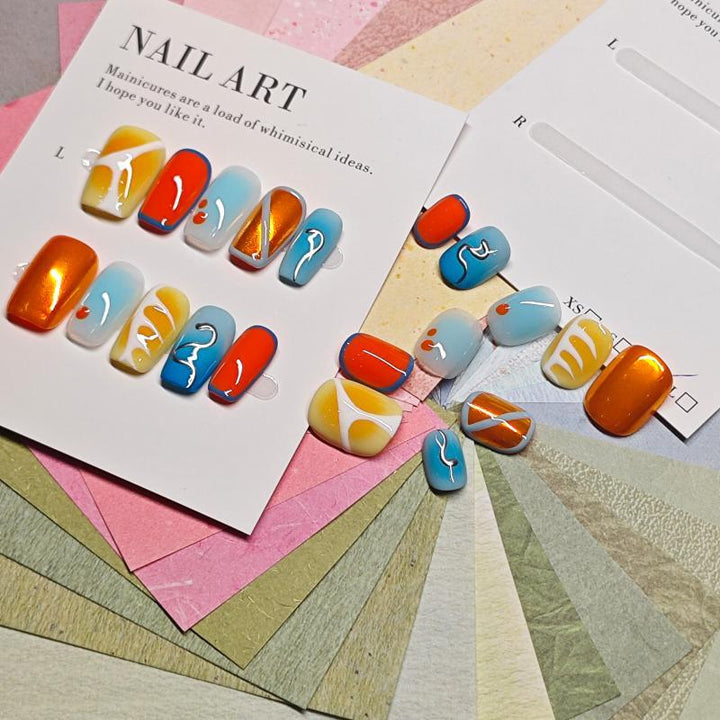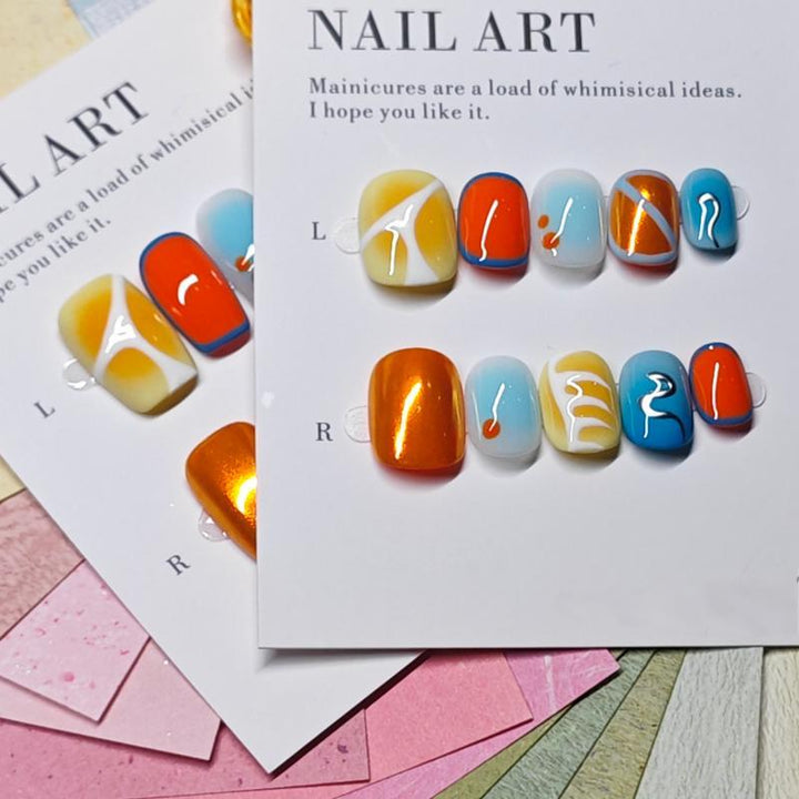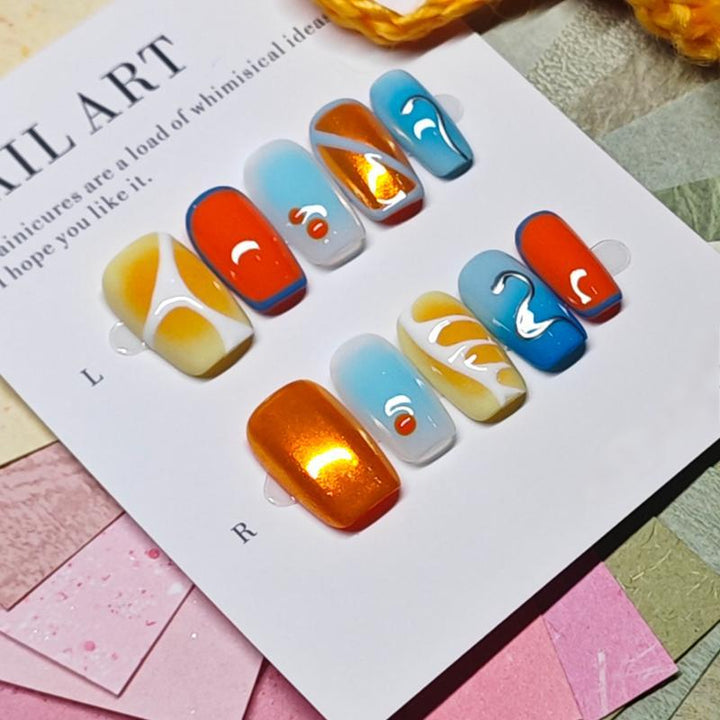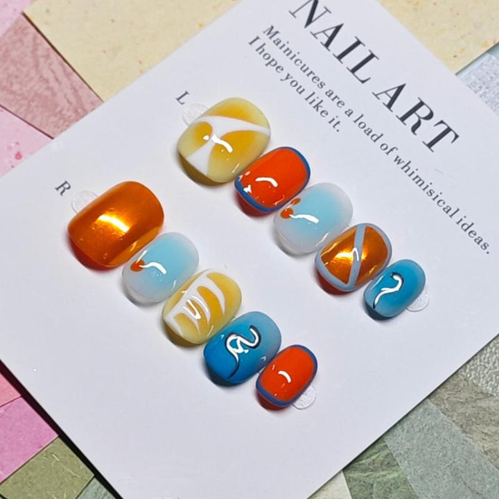 Featuring a vibrant palette of sunny orange, golden yellow, and ocean blue, paired with playful geometric patterns, gradient effects, and delicate hand-painted lines, these press-on nails capture the energetic charm of summer days. Perfect for beach getaways, festival looks, or adding a cheerful, artistic touch to your daily outfits. Easy to apply and reusable, they offer a hassle-free way to achieve salon-quality, summer-inspired nail art in minutes.