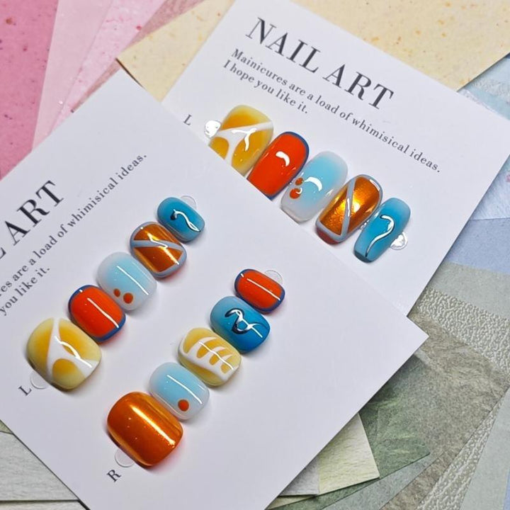 Featuring a vibrant palette of sunny orange, golden yellow, and ocean blue, paired with playful geometric patterns, gradient effects, and delicate hand-painted lines, these press-on nails capture the energetic charm of...