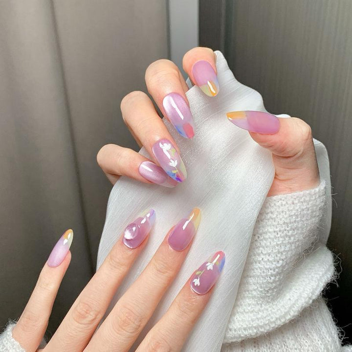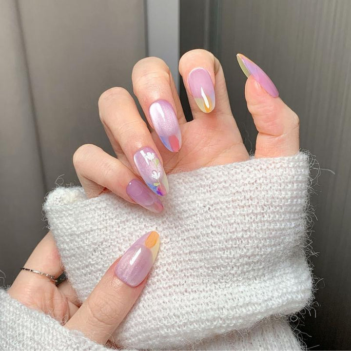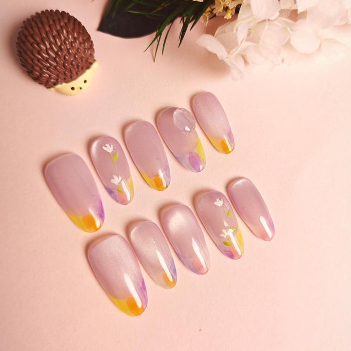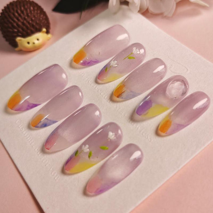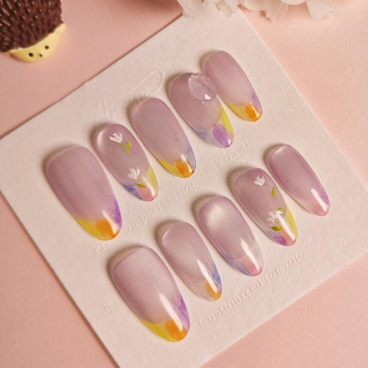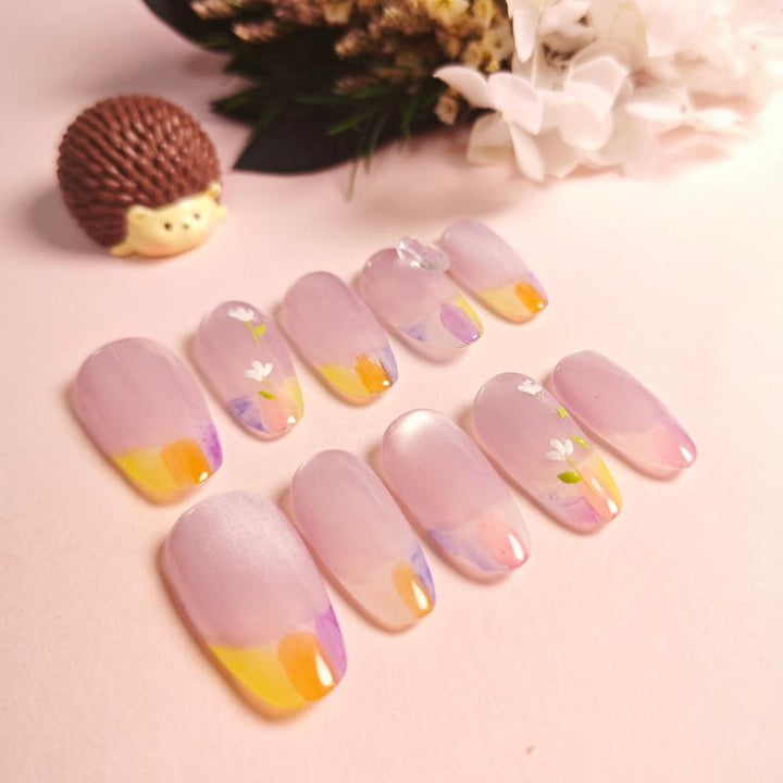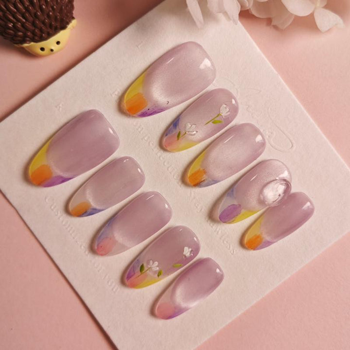 Featuring a soft pastel lavender base with vibrant gradient tips in yellow, orange, and purple hues, adorned with tiny hand-painted white flowers and a sparkling gem accent on select nails, these press-on nails blend airy charm with whimsical springtime artistry. Perfect for bridal events, garden parties, or adding a touch of ethereal elegance to your daily look. Easy to apply and reusable, they offer a hassle-free way to achieve salon-quality, eye-catching nail art in minutes.