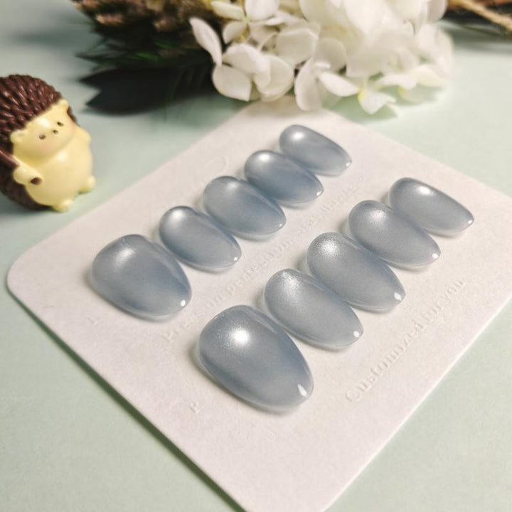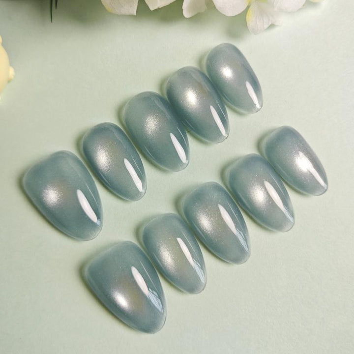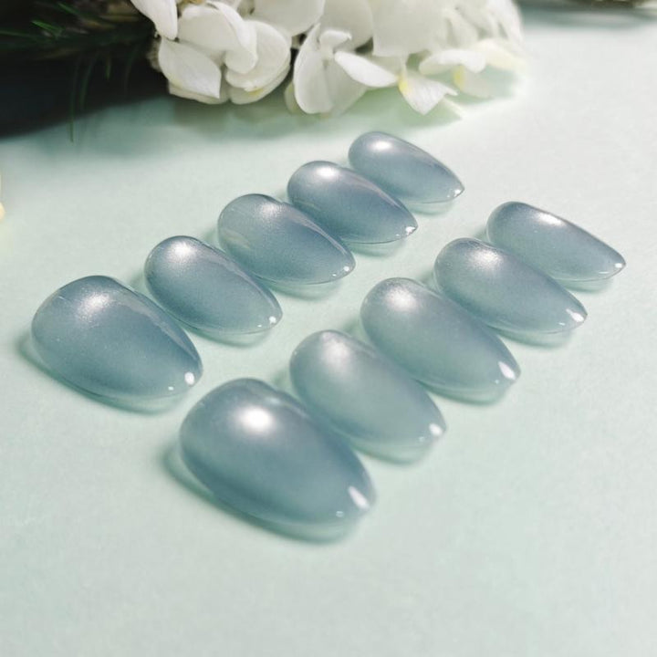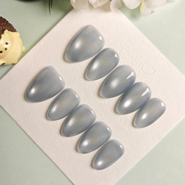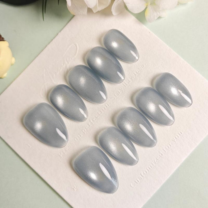 Featuring a serene soft blue-grey hue with mesmerizing cat-eye shimmer that catches light beautifully, these press-on nails offer a sleek, polished look with a touch of subtle glamour. Perfect for daily wear, office settings, or adding a refined, sophisticated touch to any outfit. Easy to apply and reusable, they provide a hassle-free way to achieve salon-quality nail art in minutes.
