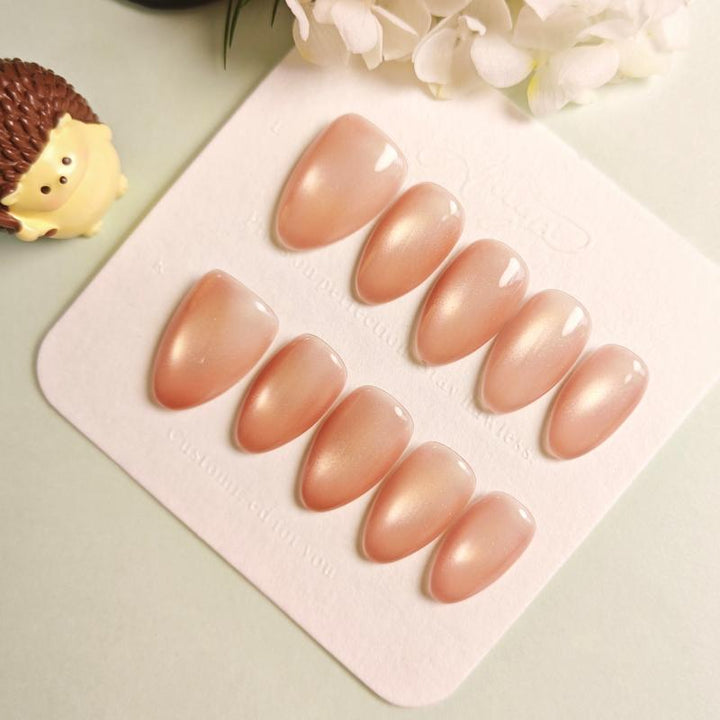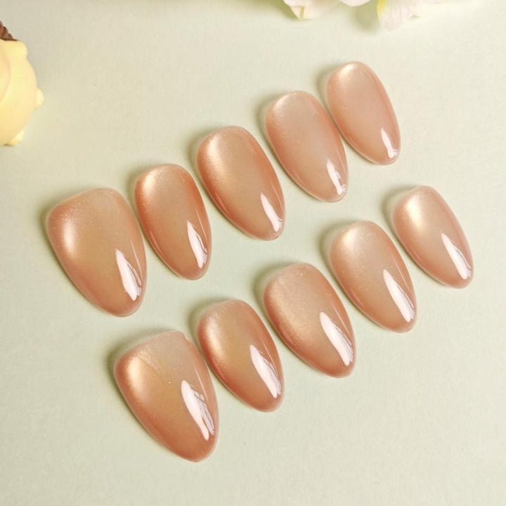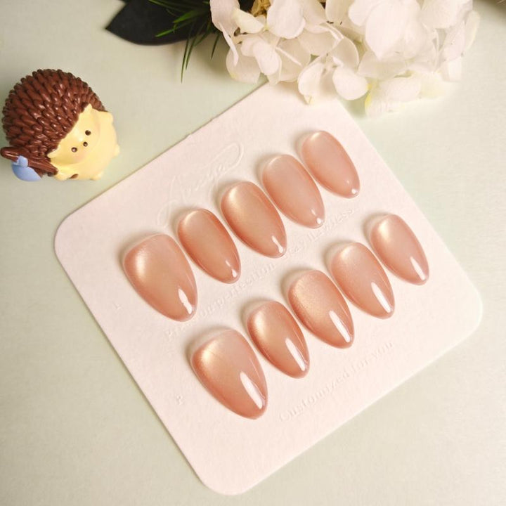 Featuring a soft nude beige hue with captivating cat-eye shimmer that creates a luminous, polished look, these press-on nails blend subtle glamour with everyday wearability. Perfect for office days, casual outings, or adding a refined touch to any ensemble. Easy to apply and reusable, they offer a hassle-free way to achieve salon-quality nail art in minutes.