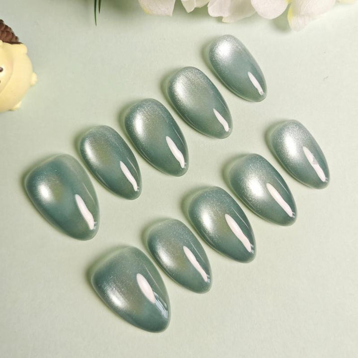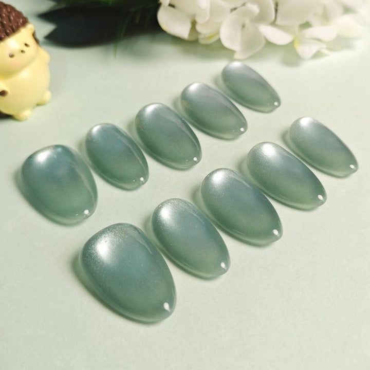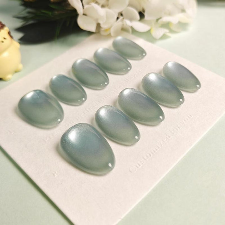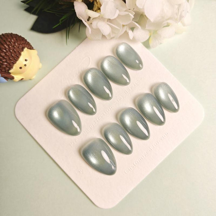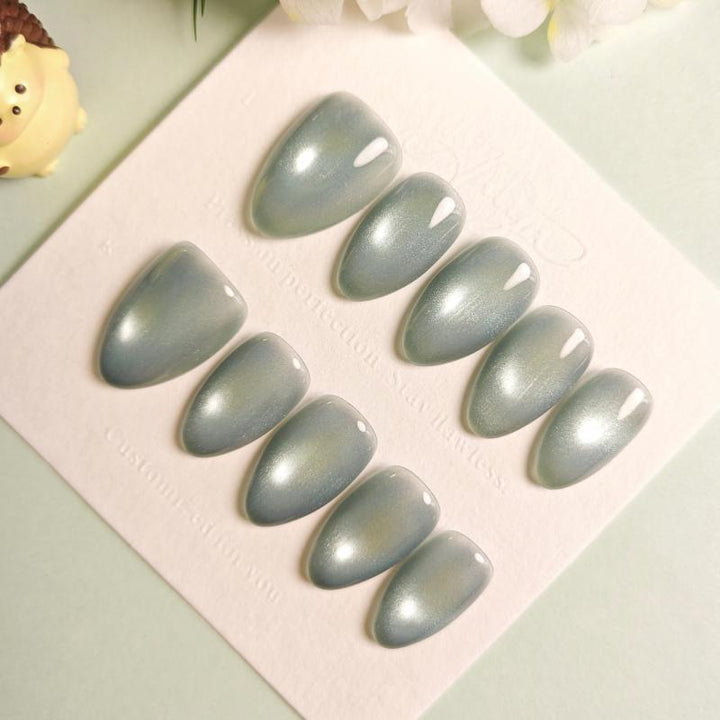 Featuring a soft light grey-blue hue with captivating cat-eye shimmer that creates a luminous, polished look, these press-on nails blend subtle glamour with a modern, chic aesthetic. Perfect for office wear, casual outings, or adding a touch of sophisticated shine to any ensemble. Easy to apply and reusable, they offer a hassle-free way to achieve salon-quality nail art in minutes.