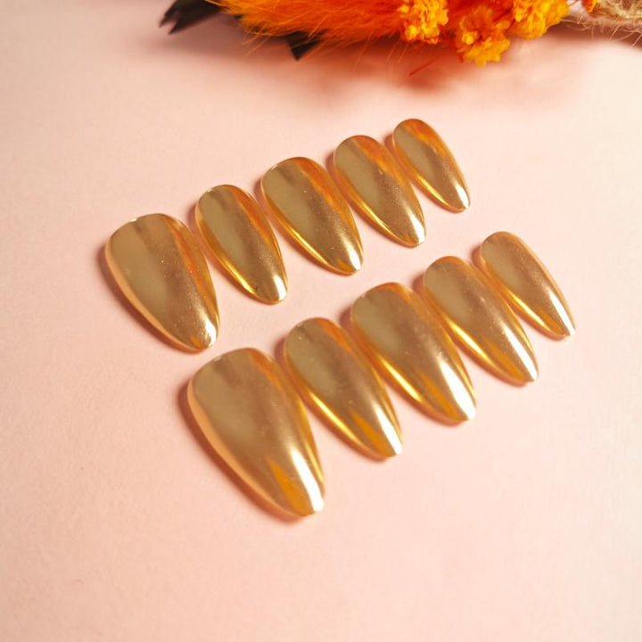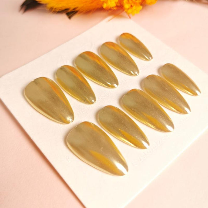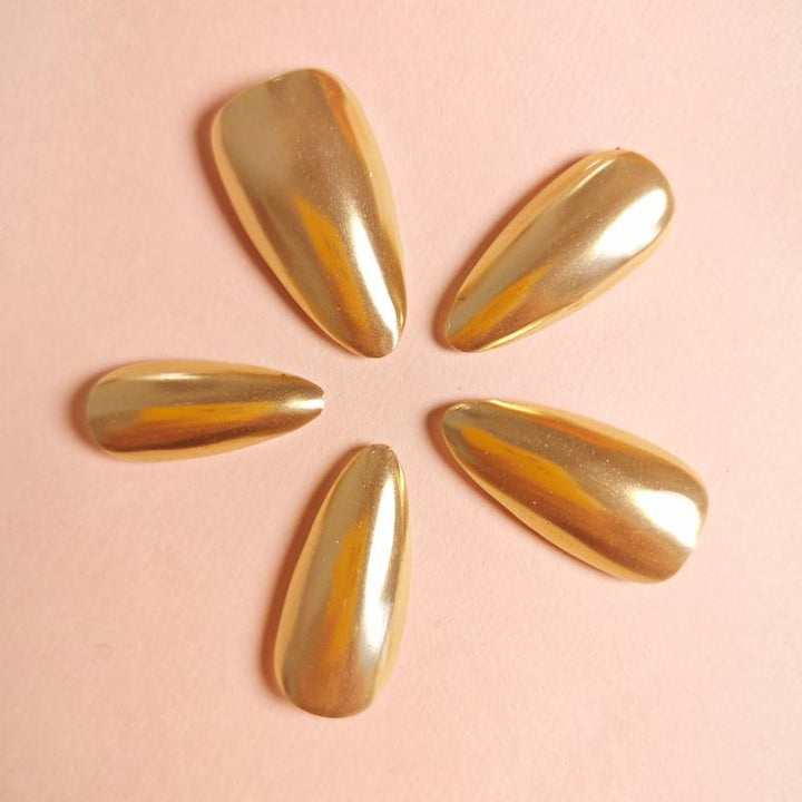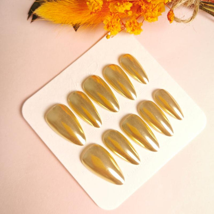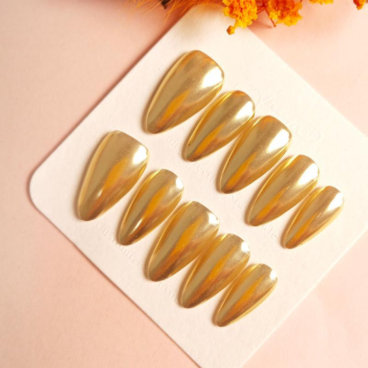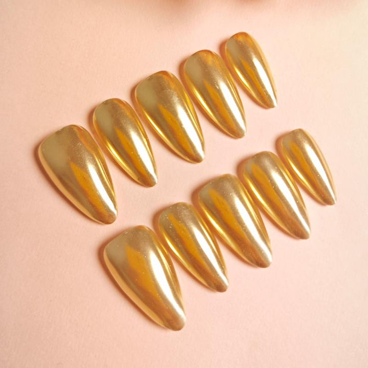 Featuring a stunning metallic gold finish with a glossy chrome effect and sleek stiletto shape, these press-on nails bring instant luxury and bold elegance to any look. Perfect for special events, evening gatherings, or adding a touch of high-shine glamour to your daily outfits. Easy to apply and reusable, they offer a hassle-free way to achieve salon-worthy, statement-making nails in minutes.