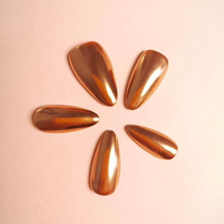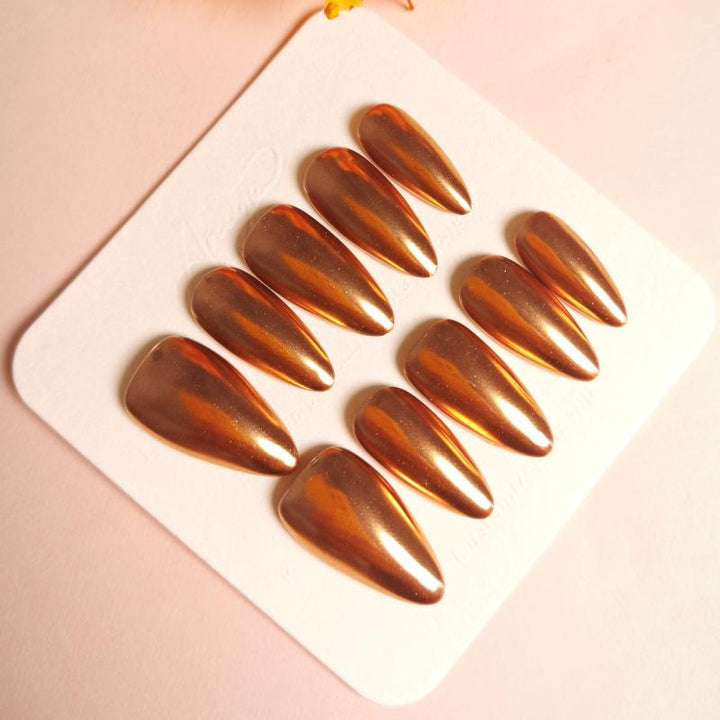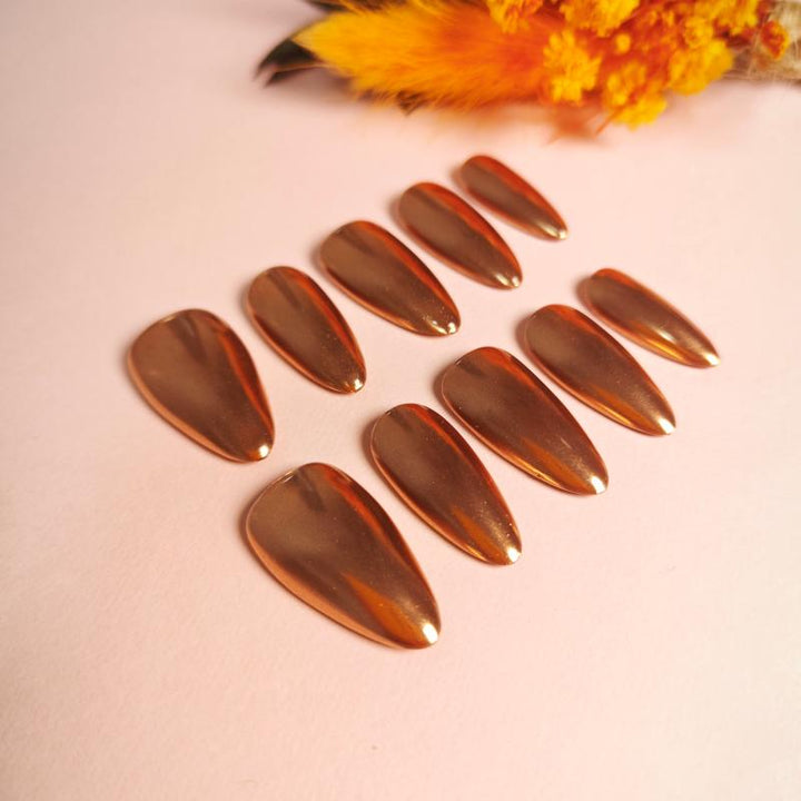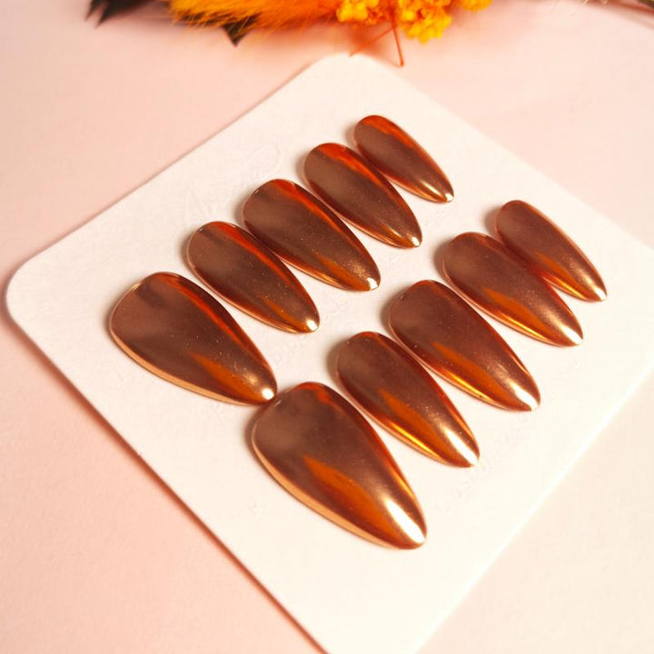 Featuring a stunning metallic copper finish with a glossy chrome effect and sleek stiletto shape, these press-on nails bring instant luxury and modern edge to any look. Perfect for parties, fashion-forward styling, or adding a touch of high-shine glamour to your everyday outfits. Easy to apply and reusable, they offer a hassle-free way to achieve salon-worthy, statement-making nails in minutes.