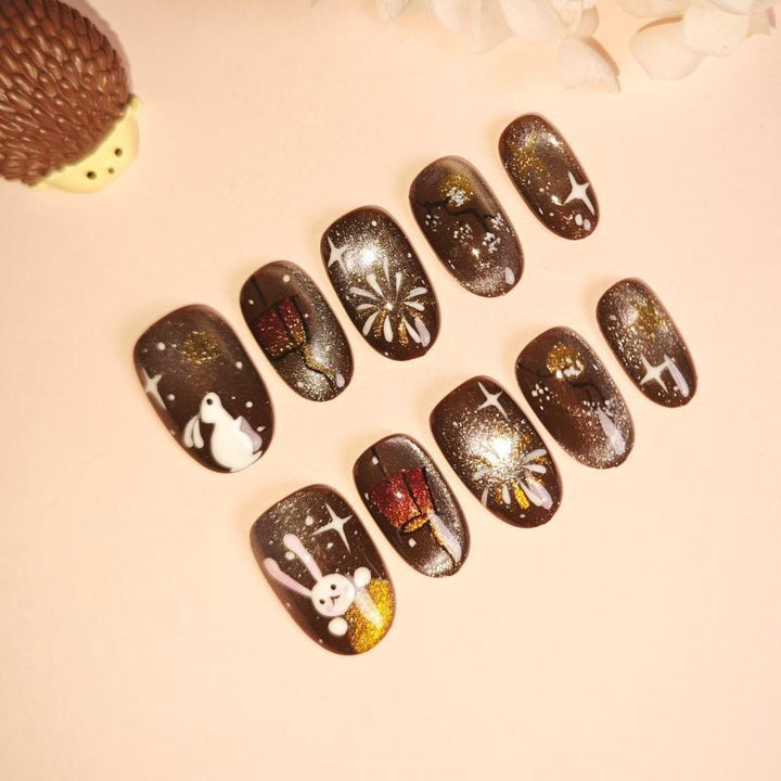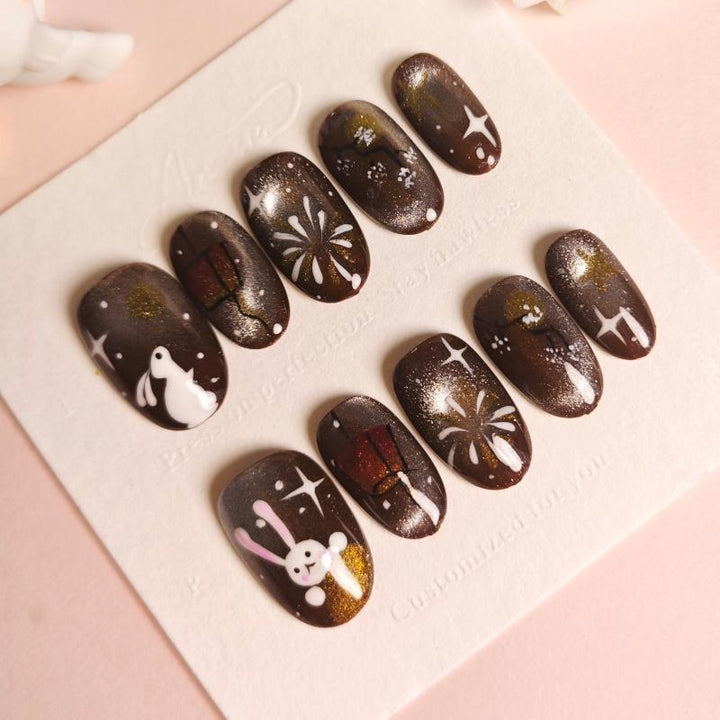 Featuring a rich dark brown base sprinkled with shimmering glitter, these nails are adorned with charming hand-painted details: cute bunnies, vibrant fireworks, twinkling stars, and golden moon accents. Perfect for holiday...