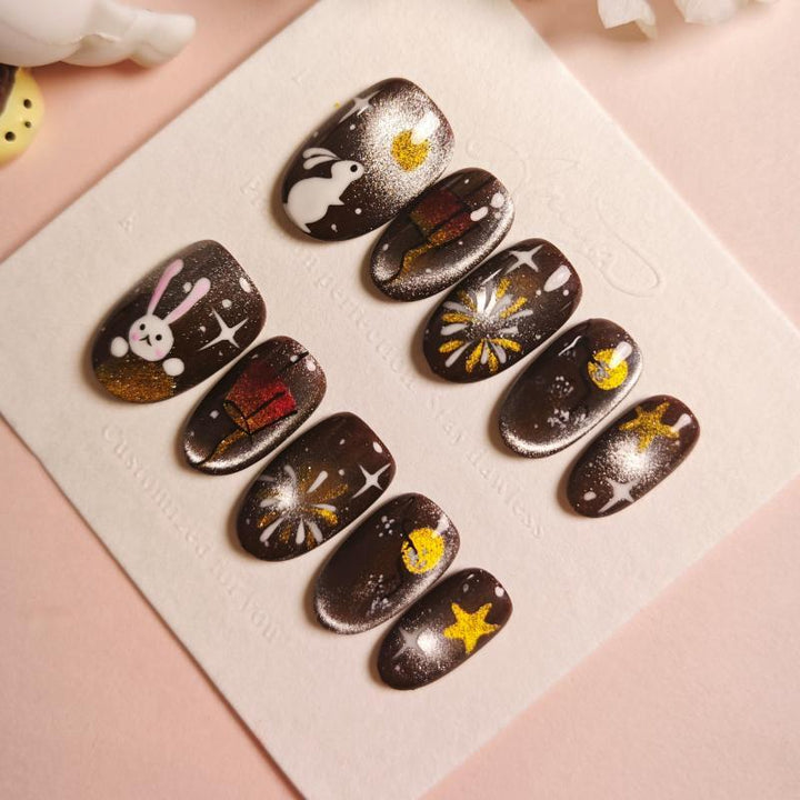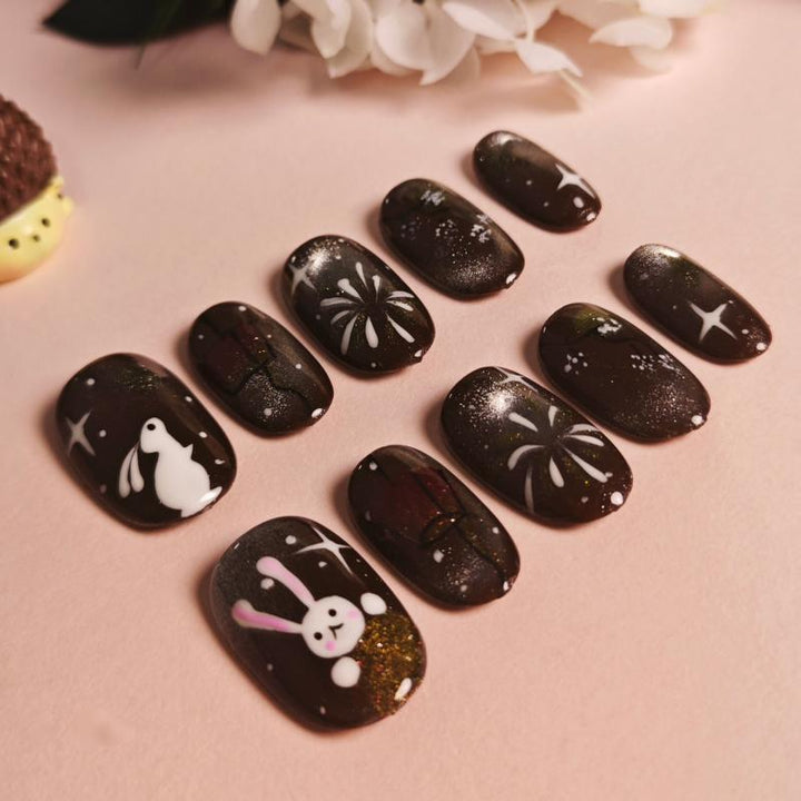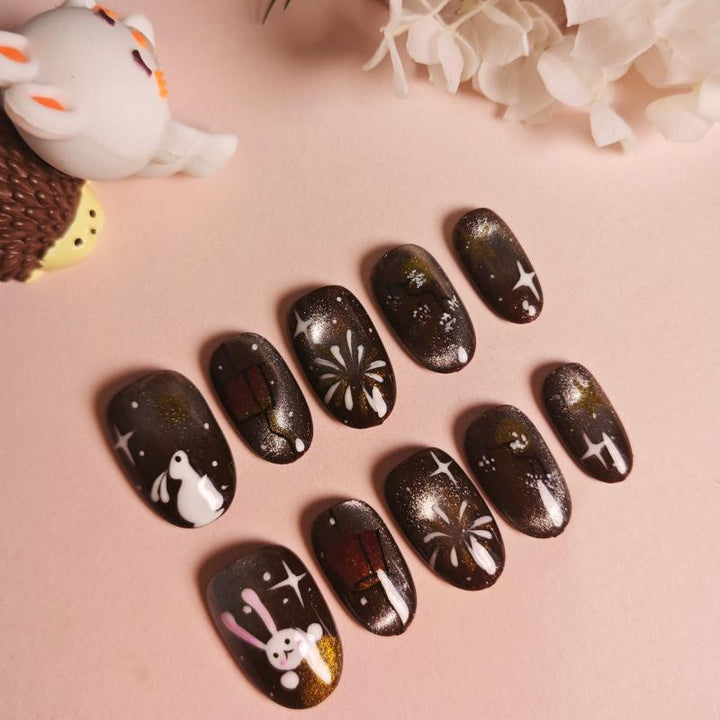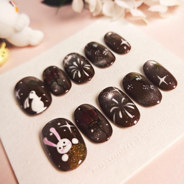 Featuring a rich dark brown base sprinkled with shimmering glitter, these nails are adorned with charming hand-painted details: cute bunnies, vibrant fireworks, twinkling stars, and golden moon accents. Perfect for holiday celebrations, themed parties, or adding a touch of fairy-tale magic to your daily look. Easy to apply and reusable, they offer a hassle-free way to achieve salon-quality, eye-catching nail art in minutes.