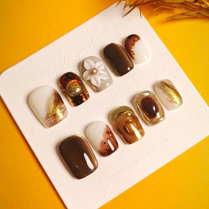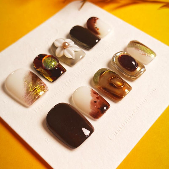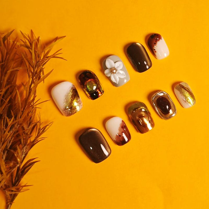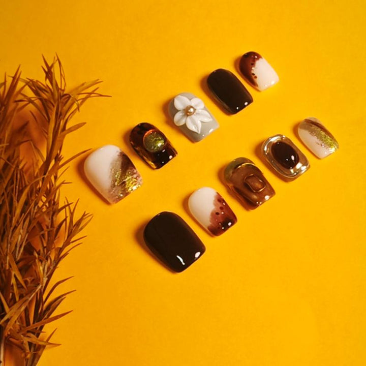 Featuring a sophisticated palette of warm browns, creamy whites, and shimmering gold accents, paired with delicate 3D floral details and artistic marbled effects, these press-on nails blend vintage charm with modern luxury. Perfect for autumn gatherings, formal events, or adding a touch of refined glamour to your daily style. Easy to apply and reusable, they offer a hassle-free way to achieve salon-quality, autumnal nail art in minutes.