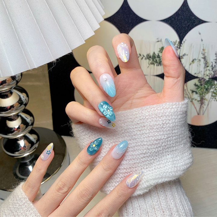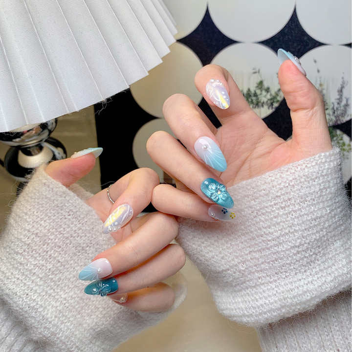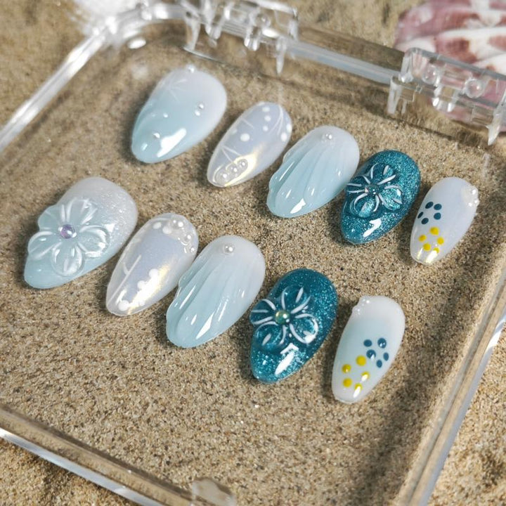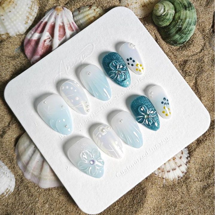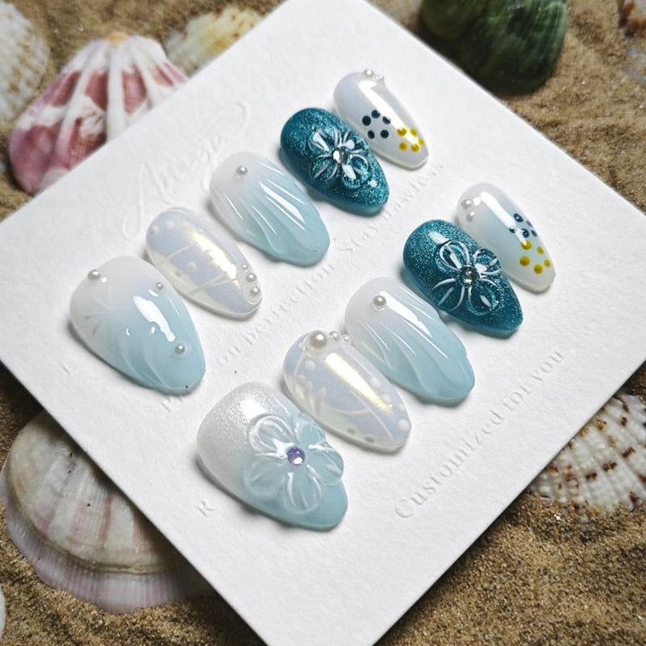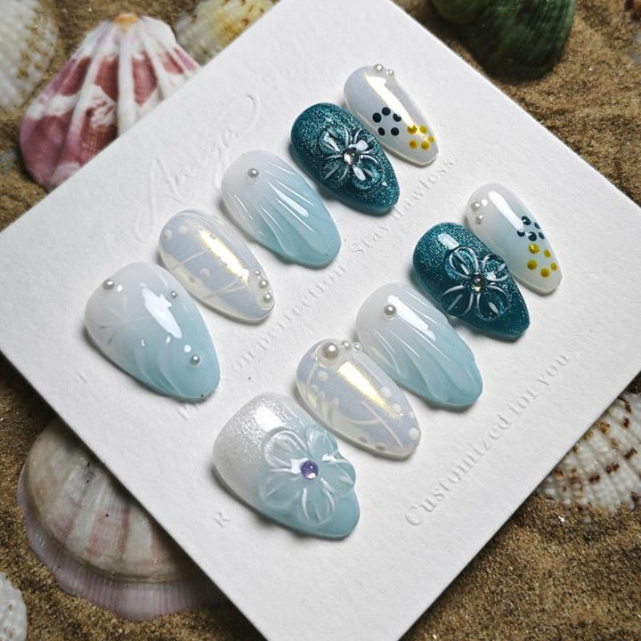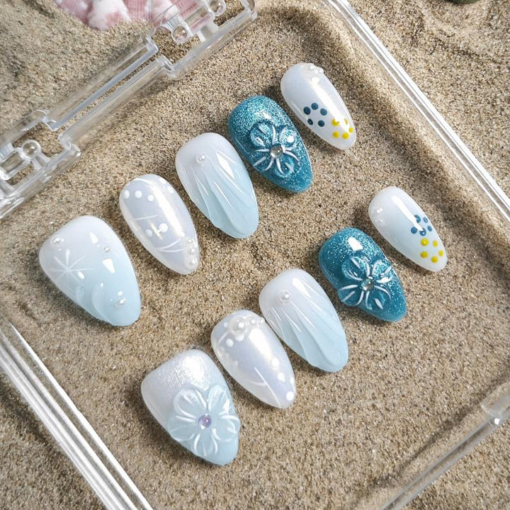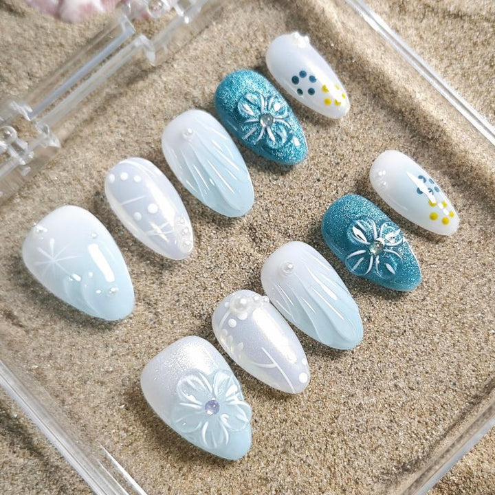 Featuring delicate 3D floral details, shimmering pearl accents, and a refreshing palette of icy blue, soft white, and glittering teal, these press-on nails capture the tranquil beauty of ocean waves and frosty coastal charm. Perfect for summer vacations, beach weddings, or adding a whimsical, fresh touch to your everyday look. Easy to apply and reusable, they bring effortless oceanic elegance to your manicure in minutes.