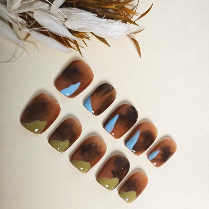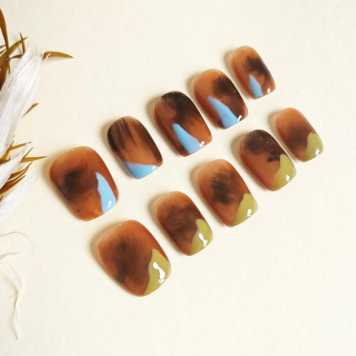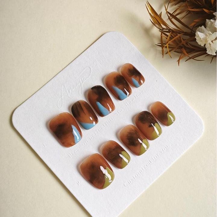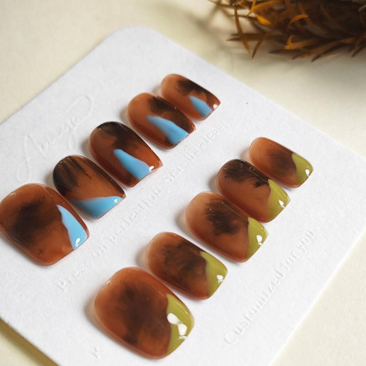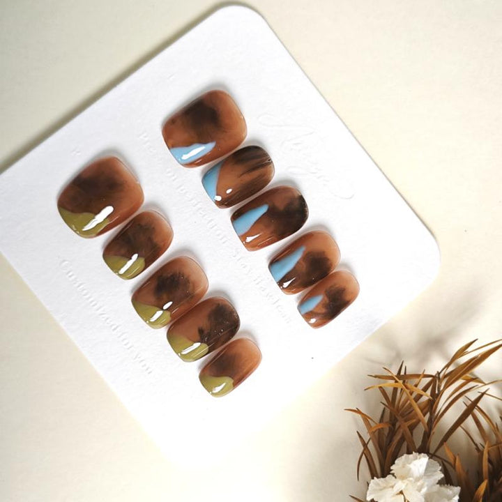 Featuring a blend of warm amber, earthy brown, and subtle pops of sky blue and moss green, these nails showcase artful watercolor-inspired and fluid marble effects. Perfect for embracing autumn vibes, adding everyday elegance, or complementing boho-chic outfits. Easy to apply and reusable, they offer a hassle-free way to achieve salon-quality, artistic nail art in minutes.