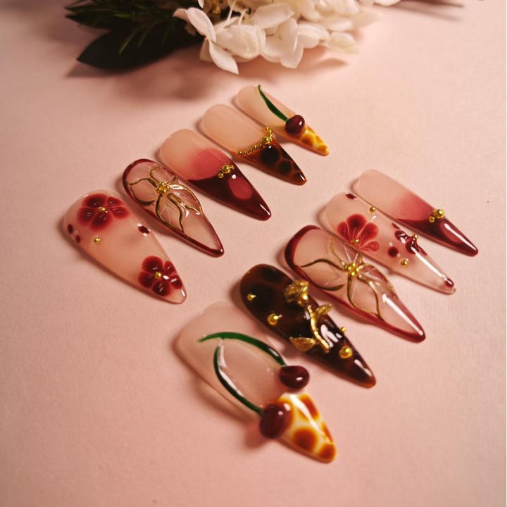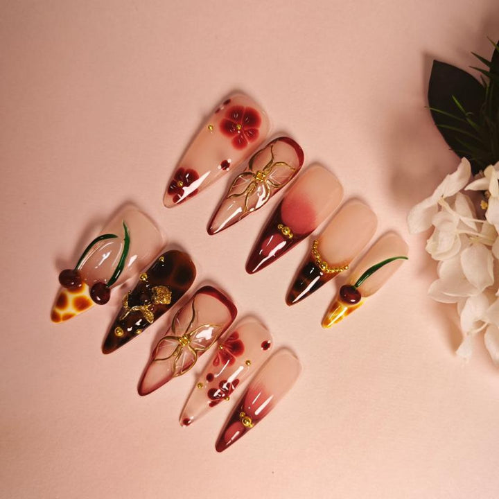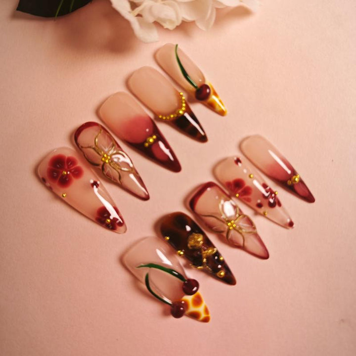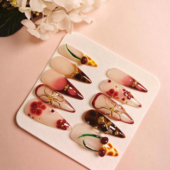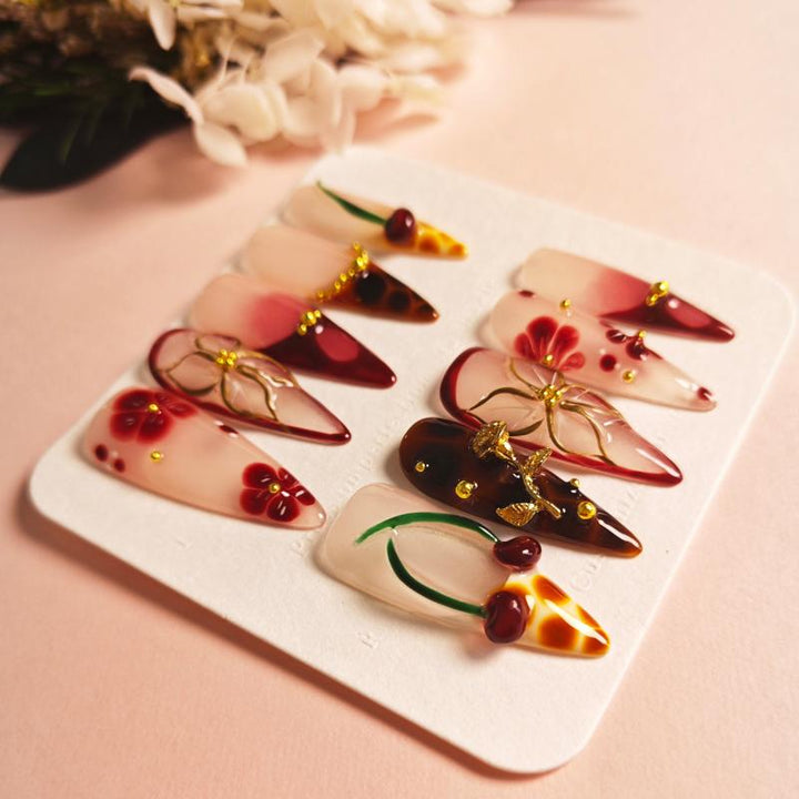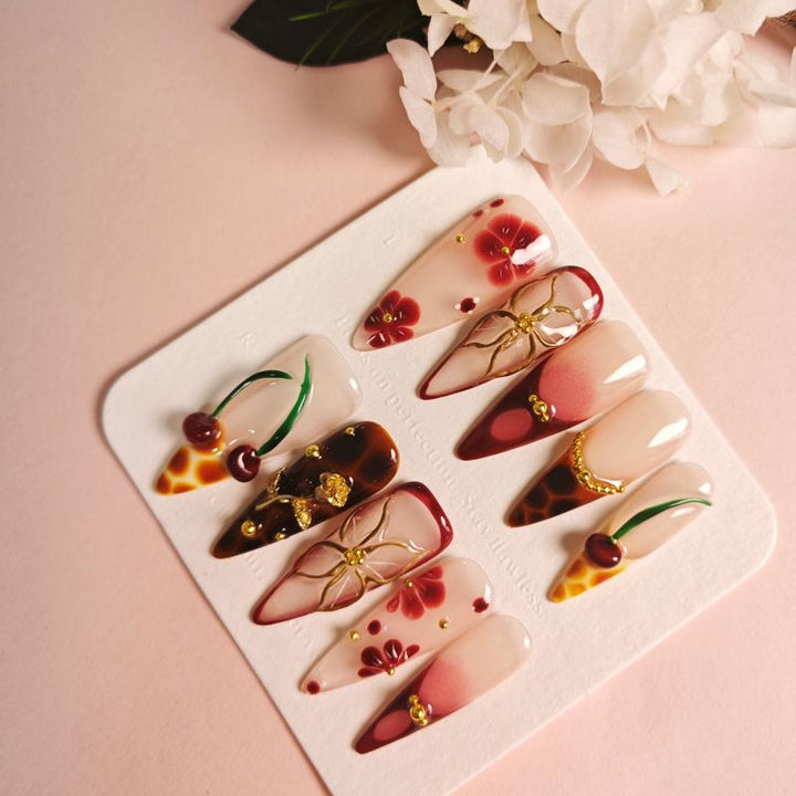 Featuring 3D cherry accents, hand-painted red florals, tortoise shell patterns, and delicate gold detailing, these press-on nails blend sweet charm with vintage elegance. Perfect for date nights, special occasions, or adding a whimsical, polished touch to your daily style. Easy to apply and reusable, they offer a hassle-free way to achieve salon-quality, artistic nail art in minutes.