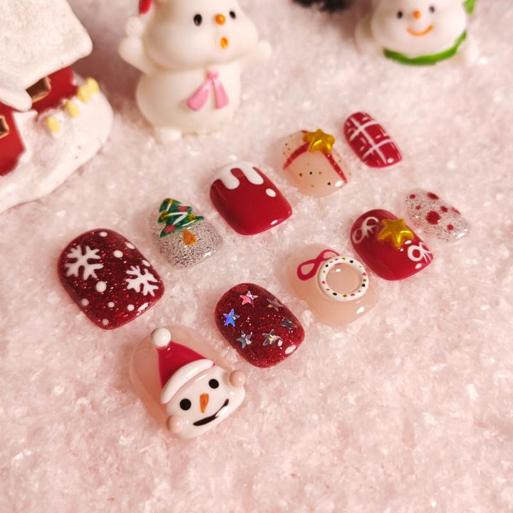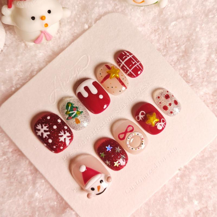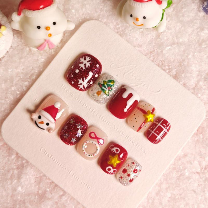 This set is a festive feast for the eyes, featuring 3D snowmen, hand-painted Christmas trees, glittering snowflakes, gift boxes, classic red plaid, and star details—every nail tells a sweet Christmas story.