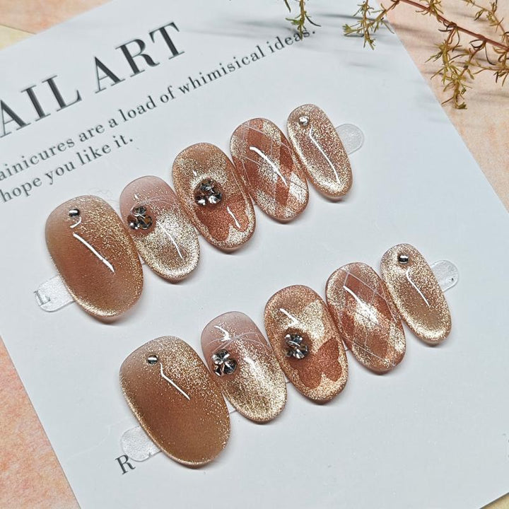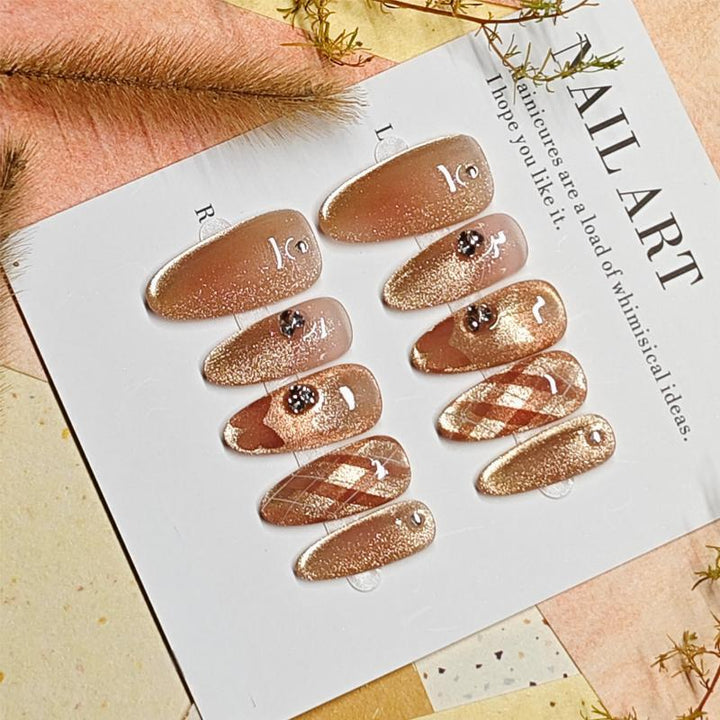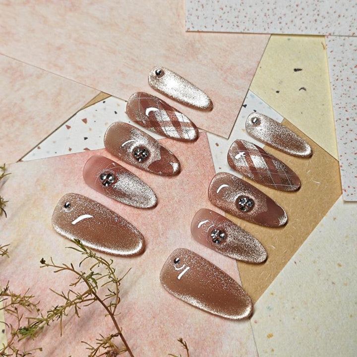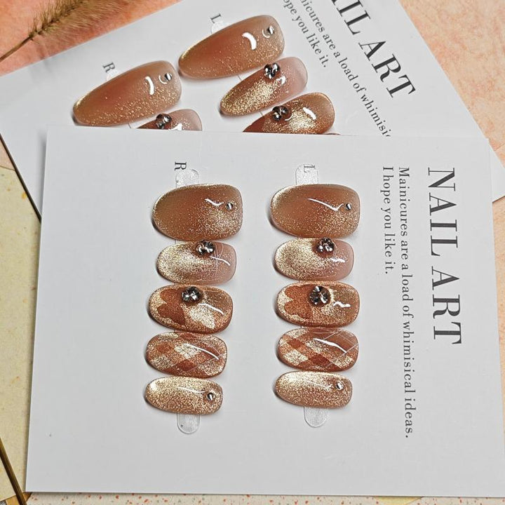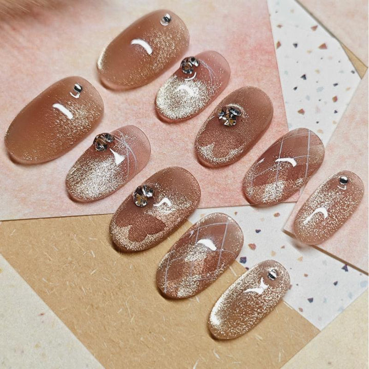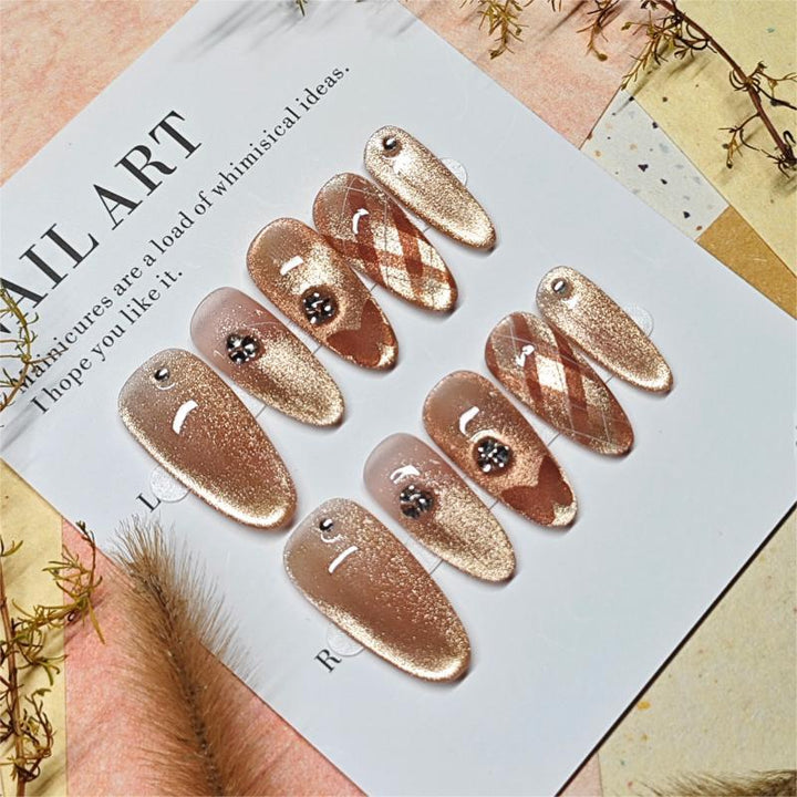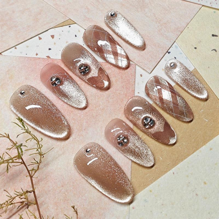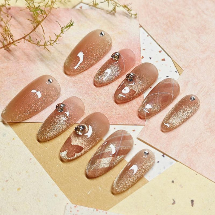Featuring a soft nude base with shimmering gold glitter, delicate argyle patterns, and sparkling rhinestone accents, these press-on nails blend subtle glamour with timeless sophistication. Perfect for special occasions, date nights, or adding a touch of luxe refinement to your daily look. Easy to apply and reusable, they offer a hassle-free way to achieve salon-quality, dazzling nail art in minutes.