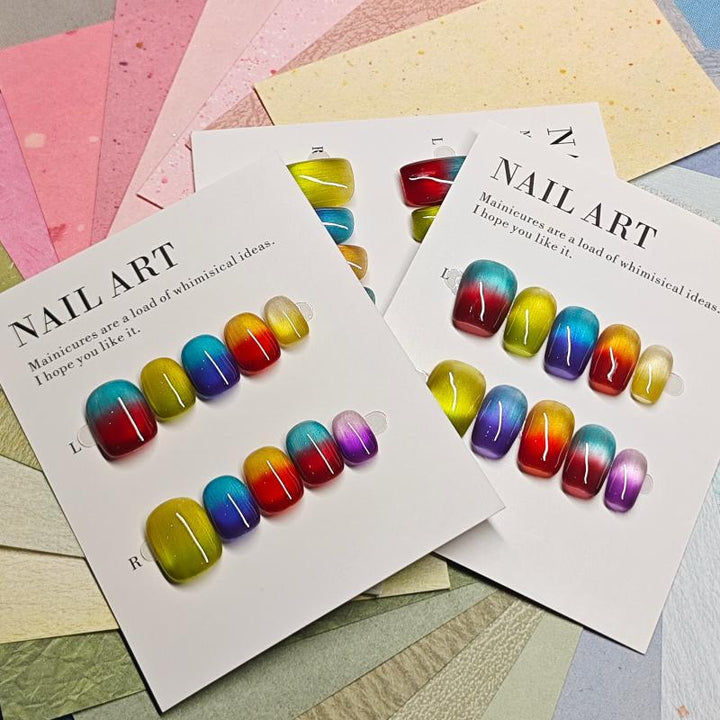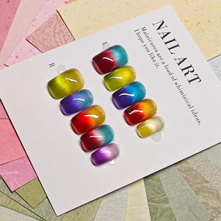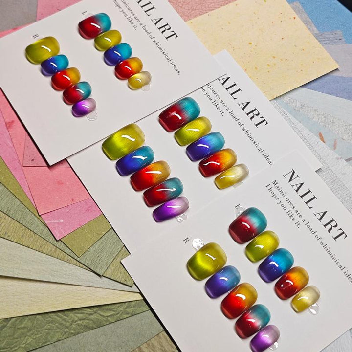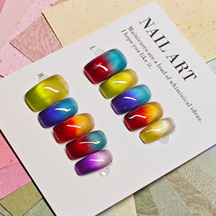 Featuring vivid rainbow hues (red, blue, yellow, purple) in smooth, jelly-like gradient effects, these press-on nails bring a burst of cheerful, vibrant energy to any look. Perfect for festivals, summer adventures, or adding a whimsical, colorful touch to your daily outfits. Easy to apply and reusable, they offer a hassle-free way to achieve salon-quality, eye-catching nail art in minutes.