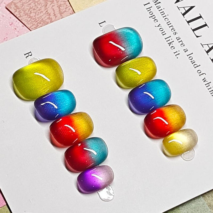 Featuring vivid rainbow hues (red, blue, yellow, purple) in smooth, jelly-like gradient effects, these press-on nails bring a burst of cheerful, vibrant energy to any look. Perfect for festivals, summer adventures,...