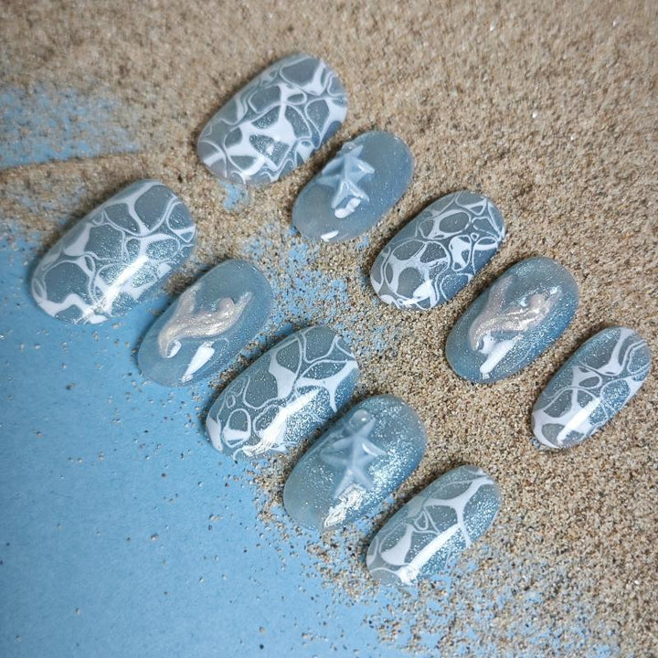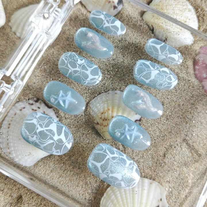 Elevate your coastal style with Shimmering Ocean Starfish Press-on Nails! Featuring glossy, iridescent light blue hues, delicate ocean-inspired patterns, and tiny 3D starfish accents, these press-on nails capture the shimmer of sea waves and the charm of beach treasures. Perfect for summer vacations, beachside outings, or adding a subtle, sparkling ocean touch to your everyday look. Easy to apply and reusable, they bring effortless seaside elegance to your manicure in minutes.