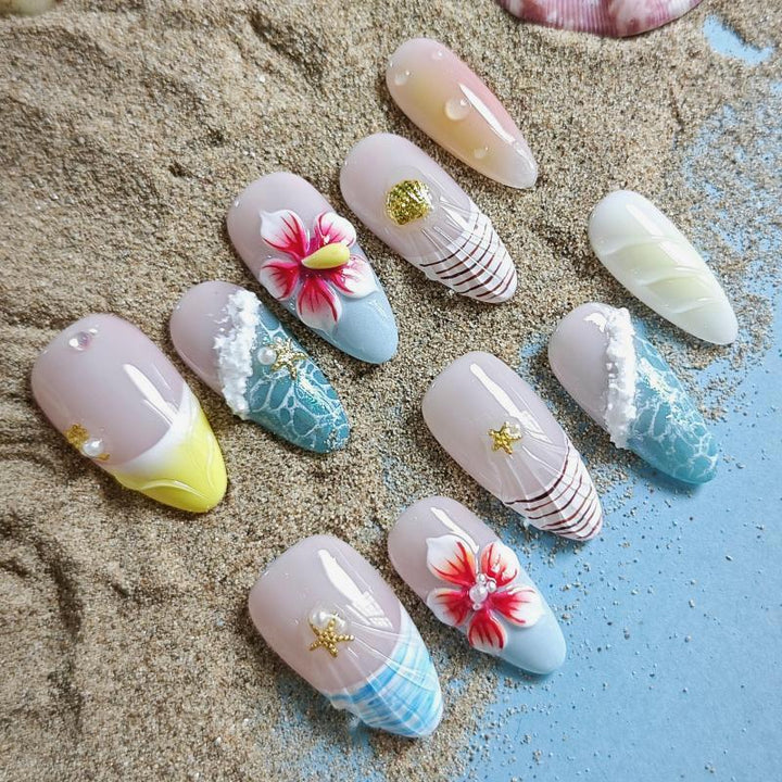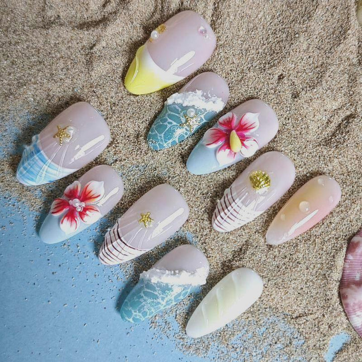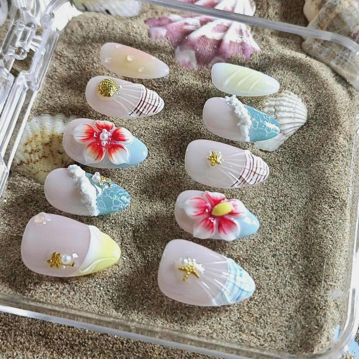 Elevate your summer manicure with Tropical Beach Blossom Press-on Nails! Featuring delicate seashells, starfish, vibrant floral accents, and soft ocean-inspired hues, these press-on nails capture the essence of a tropical beach getaway....