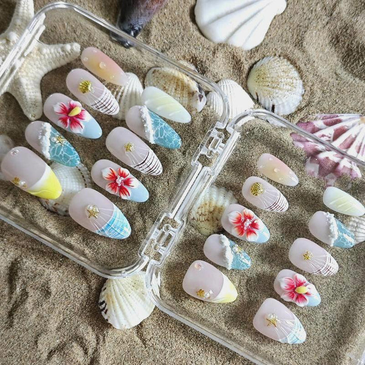 Elevate your summer manicure with Tropical Beach Blossom Press-on Nails! Featuring delicate seashells, starfish, vibrant floral accents, and soft ocean-inspired hues, these press-on nails capture the essence of a tropical beach getaway. Perfect for vacation vibes, beachside adventures, or adding a breezy, coastal touch to your everyday style. Easy to apply and reusable, they bring effortless seaside charm to your look.