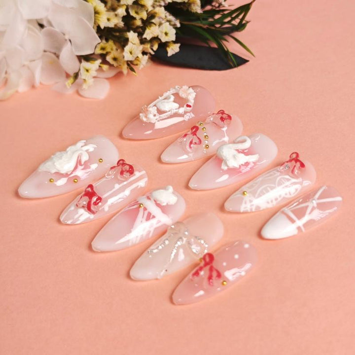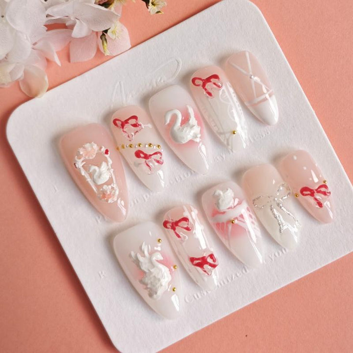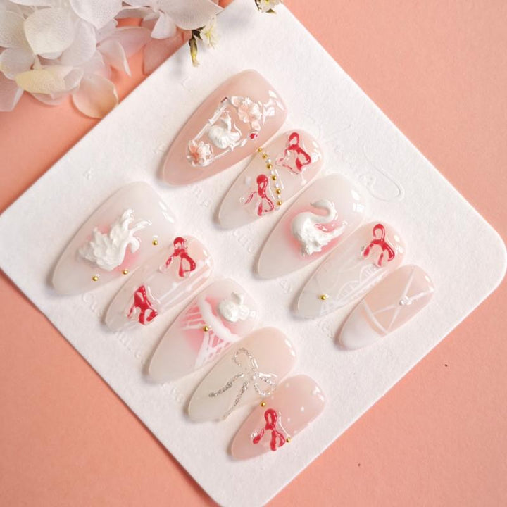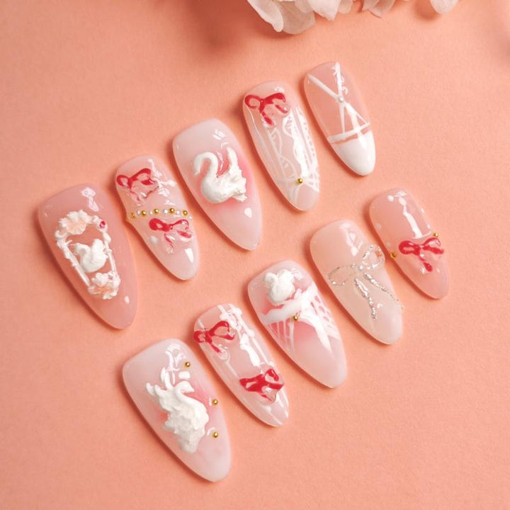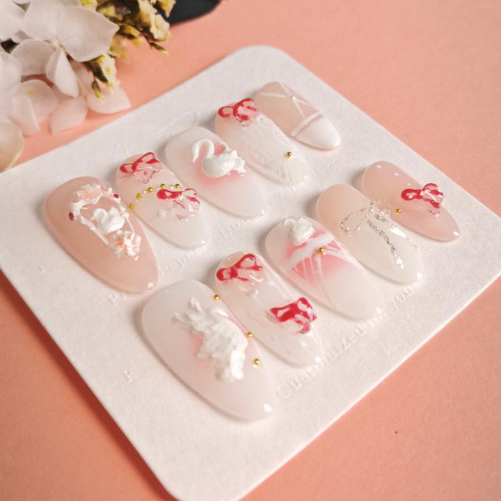 Featuring a soft pink and white base, adorned with 3D art details like elegant swans, cute bunnies, delicate red bows, and tiny gold accents, these press-on nails blend whimsical charm with delicate sophistication. Perfect for bridal events, tea parties, or adding a touch of enchanted elegance to your daily look. Easy to apply and reusable, they offer a hassle-free way to achieve salon-quality, eye-catching nail art in minutes.