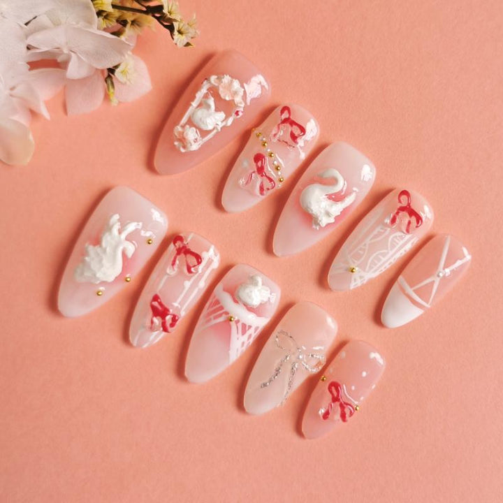 Featuring a soft pink and white base, adorned with 3D art details like elegant swans, cute bunnies, delicate red bows, and tiny gold accents, these press-on nails blend whimsical charm with...